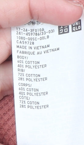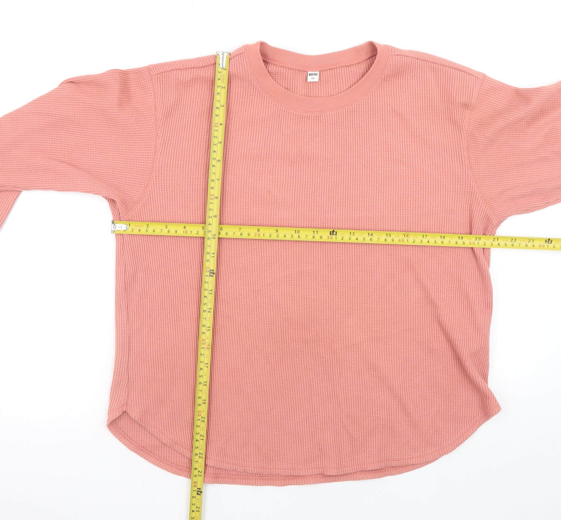 This charming Uniqlo women’s top in a lovely soft pink shade is the perfect everyday piece to refresh your wardrobe. Designed in a lightweight cotton-polyester blend, this top offers both comfort and easy wear with a breathable feel. The fabric’s subtle waffle-like texture adds a stylish element while maintaining a casual, laid-back look. Featuring a classic crew neckline and long sleeves with slightly fitted cuffs, this top delivers a timeless style suitable for wearing on its own or layering beneath jackets and cardigans through spring and autumn. The pullover design ensures effortless dressing, making it an ideal grab-and-go addition for casual days. The regular fit ensures a flattering yet relaxed silhouette that complements most body shapes. A solid colour finish makes it easy to match with jeans, skirts, or smart-casual trousers, making it a versatile piece to wear for lounging, errands, or casual meet-ups. In excellent pre-owned condition with no visible flaws, this Uniqlo top retains its softness and structure, demonstrating fine craftsmanship and durable stitching typical of the brand’s quality clothing. Machine washable for easy care, it offers a great balance of practicality and comfort. Overall, this Basic Long Sleeve Cotton Blend T-Shirt brings all-round appeal — effortlessly blending style, versatility, and comfort, making it a wardrobe essential for laid-back and everyday occasions. Add it to your collection for a pop of soft pink that transitions easily between seasons and settings.