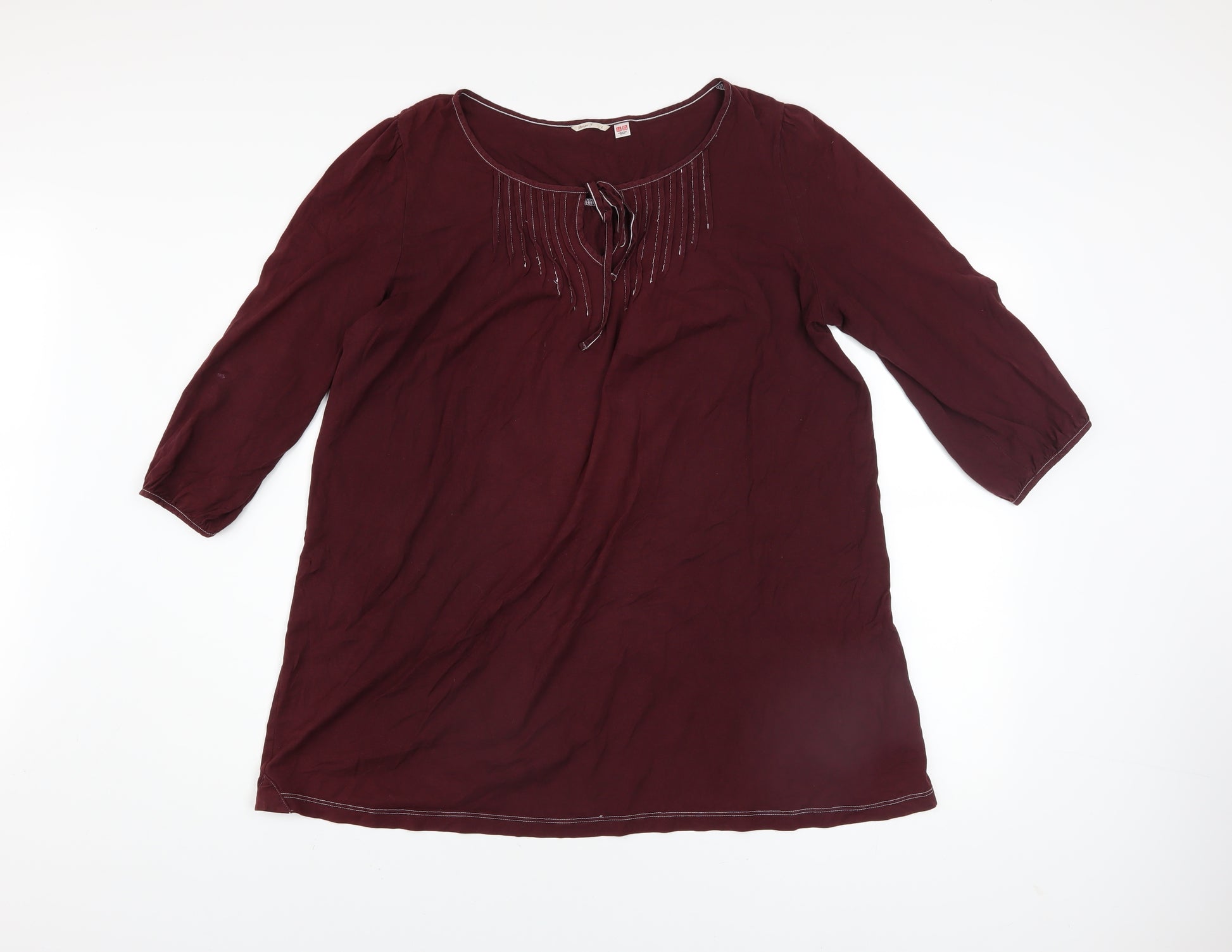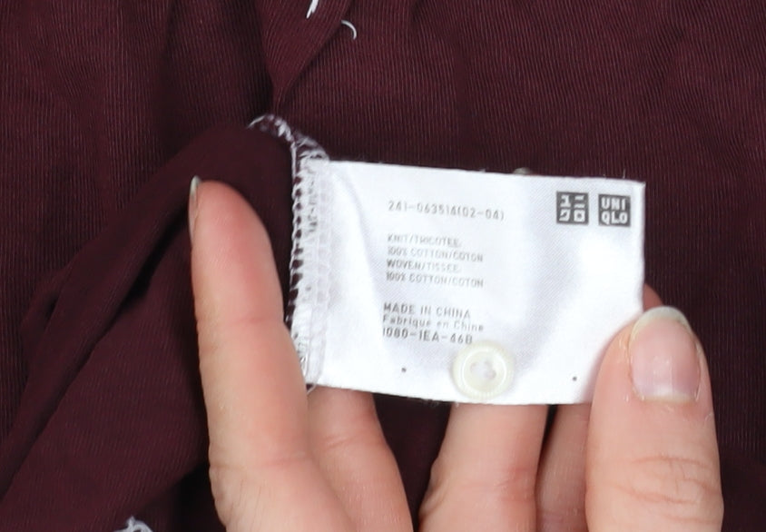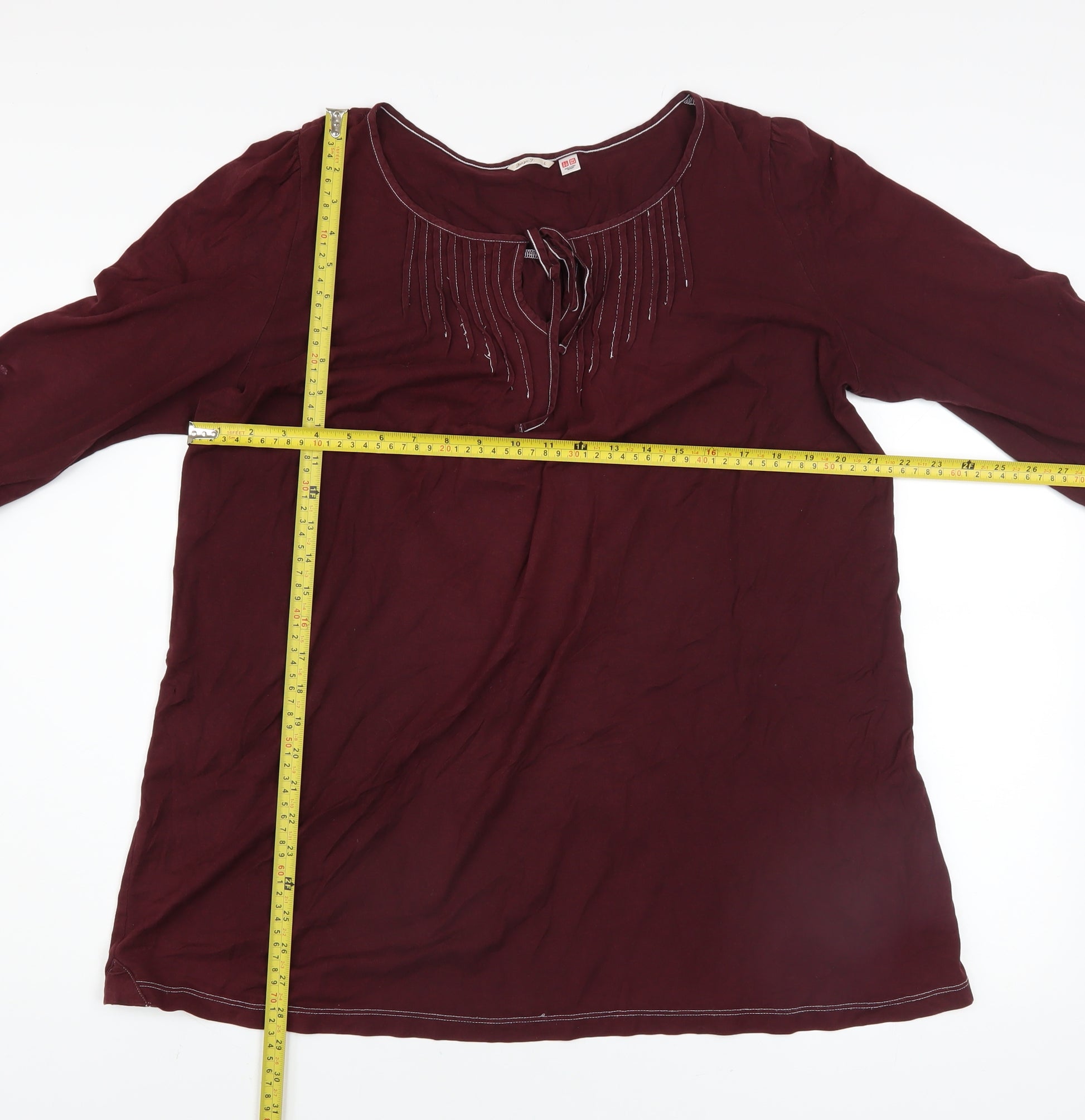 This elegant Uniqlo women’s tunic blouse offers a blend of casual comfort and timeless style, perfect for everyday wear or relaxed occasions. Presented in a deep brown shade, the piece brings warmth and versatility to any wardrobe. Crafted from breathable 100% cotton fabric, it ensures a soft touch and lightweight feel for year-round comfort. The woven cotton construction contributes to its smooth texture and flowy drape, creating a flattering silhouette that’s both relaxed and stylish. Designed with a classic scoop neckline and delicate tie detailing, it adds a feminine touch that elevates its laid-back charm. Beaded embellishments near the neckline bring subtle dimension without overpowering the simplicity of the piece. The blouse features 3/4 length sleeves with a slightly fitted shape for a balanced and comfortable fit. Ideal for layering or wearing on its own, it easily pairs with jeans, tailored trousers or skirts, making it suitable for casual outings, workwear, or weekend looks. This piece is machine washable, offering easy garment care and durability. Although gently used, it remains in good condition with minor small holes near the hem that do not detract from its overall appeal. Perfect for the transitional seasons of spring and autumn, this Uniqlo blouse is a wardrobe essential that combines effortless sophistication with practicality. Whether styled with statement jewellery for a refined look or worn simply for everyday comfort, this item embodies the brand’s commitment to quality and modern design at an affordable price.