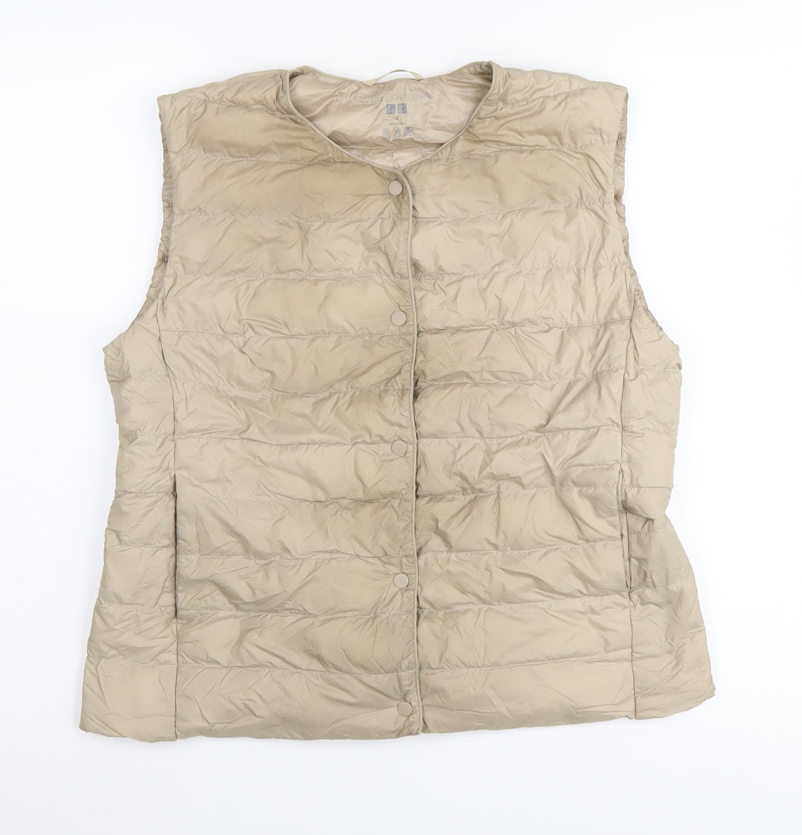Discover the perfect blend of style and comfort with this UNIQLO Women's Beige Puffer Waistcoat. Designed for the discerning fashion-forward woman, this waistcoat features a luxurious beige hue that effortlessly complements any outfit. Expertly crafted with 100% polyamide on both the outer and back, it offers a sleek and smooth finish that is both durable and appealing. The down insulation, composed of 90% down and 10% feathers, ensures warmth without adding unnecessary bulk, making it ideal for all-season wear. Its sleeveless design offers versatility, allowing you to layer it over different outfits ranging from cosy sweaters to sleek long-sleeve shirts. The snap closure adds a touch of convenience, making it easy to put on and take off while maintaining its streamlined appearance. Lightweight and breathable, it's perfect for casual walks in the park or running errands around town. Pair it with your favourite jeans or leggings for an effortlessly chic look. Available in size M, it provides a comfortable classic fit for women who appreciate understated style. Whether you're looking to update your wardrobe staples or searching for a gift for that special someone, this waistcoat ticks all the boxes.