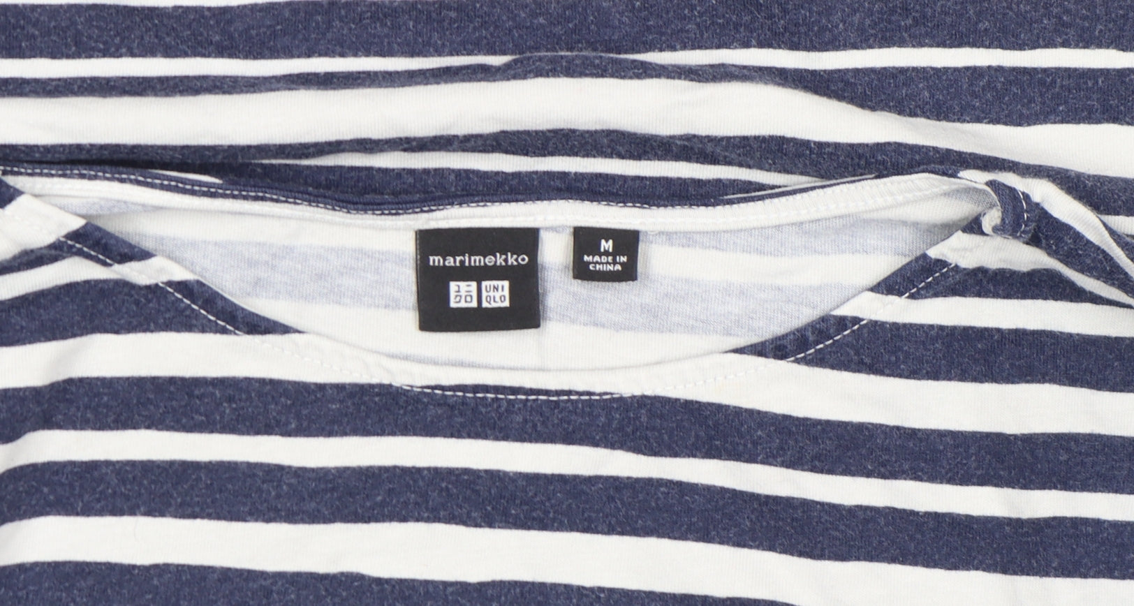 Add a touch of Scandinavian charm to your casual wardrobe with this Uniqlo x Marimekko women’s striped T-shirt. Crafted from 100% soft cotton, this breathable jersey top ensures comfort and durability in every wear. Presented in a classic navy and white stripe design, it offers a timeless nautical aesthetic that’s easy to style all year round. The relaxed fit and short sleeves make it perfect for laid-back outings, holidays, or easy weekend dressing. Featuring a crew neckline and pullover closure, the top combines a minimalist silhouette with premium quality. The all-seasons cotton fabric ensures versatility, keeping you cool in the summer and comfortably layered in the cooler months. Whether paired with denim, linen trousers, or layered under a blazer, this piece easily complements both casual and semi-smart looks. Designed by Uniqlo in collaboration with iconic Finnish brand Marimekko, it captures signature simplicity and Nordic flair. The soft jersey construction moves with you for an effortless fit, while its high-quality make guarantees lasting style. This top makes an excellent wardrobe staple for women who appreciate modern design with a classic twist. Ideal for those who love clean lines, stripes, and the relaxed charm of cotton comfort. In excellent pre-owned condition with no notable flaws or marks, it has been carefully checked to ensure quality. A go-to essential that’s easy to wear and care for, offering a smart everyday option that exudes casual chic. Machine washable and built for comfort, it’s perfect for spring and summer days, easily transitioning between seasons. A versatile, fashionable choice for holiday wear, weekend getaways, or simply running errands in style. Priced affordably, this Uniqlo x Marimekko piece blends quality and design seamlessly, offering both comfort and elegance in equal measure — perfect for the modern woman with an eye for detail and minimal effort refinement.