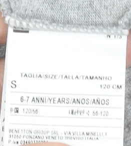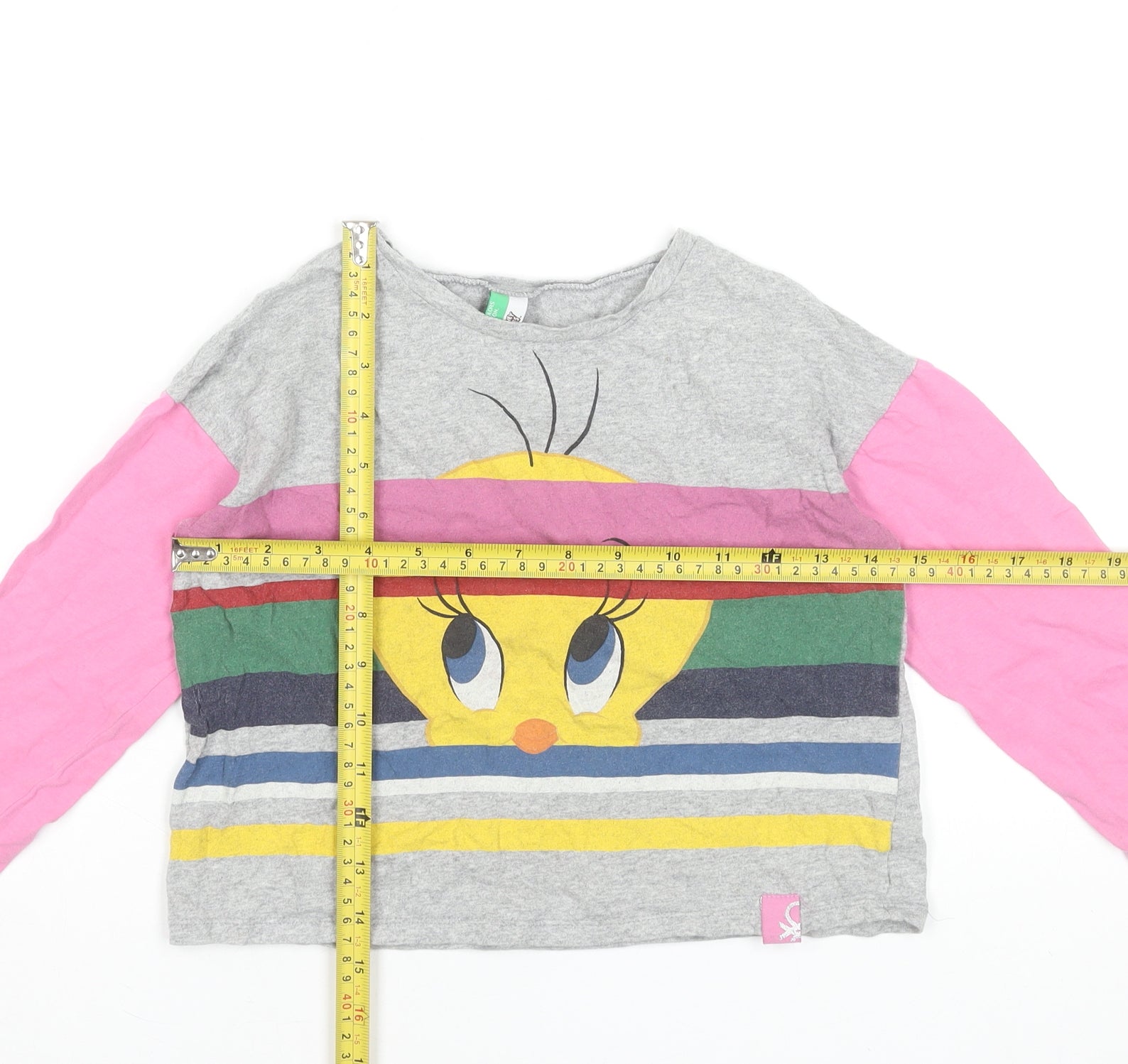 Brighten up her wardrobe with this cheerful United Colors of Benetton girls’ long sleeve T-shirt featuring the lovable Tweety character from Looney Tunes. Perfect for fans of animated classics, this fun top combines playful design with trusted quality. Crafted from a comfortable jersey fabric made of 95% cotton and 5% elastane, the shirt feels soft against the skin and offers just the right amount of stretch for everyday wear. The mixed colour pattern features a grey body with eye-catching pink sleeves and a vibrant striped front that highlights Tweety’s sweet face. Designed in a pullover style with a classic crew neckline, it ensures easy dressing while maintaining a relaxed, regular fit ideal for casual outings, school days, or playtime adventures. The breathable nature of the cotton material makes it suitable for all seasons, ensuring comfort whether worn alone on a mild day or layered under a jumper in cooler months. The shirt bears the unmistakable United Colors of Benetton branding tag along with an official Looney Tunes label, confirming both quality and authenticity. It has been carefully checked and is in excellent pre-loved condition, showing minimal signs of wear with no noticeable flaws or marks. Though the original retail tags are not attached, the bright colours and playful print remain in lovely shape. Machine washable and easy-care, this delightful top is a stylish and practical choice for young fans who love characters with personality. Whether paired with jeans, leggings, or a skirt, this Tweety T-shirt will add a pop of fun to any outfit while keeping your child comfortable throughout the day. Affordable, cute, and colourful, it’s a lovely addition to any girl’s everyday collection.