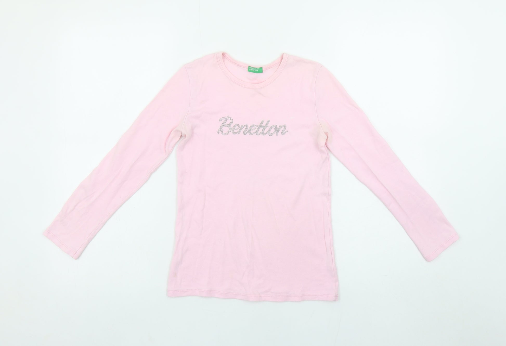 Add a touch of classic charm to your little one’s wardrobe with this adorable United Colors of Benetton girls’ pink long sleeve T-shirt. Crafted from 100% soft cotton, this top provides unbeatable comfort for everyday wear while retaining its signature Benetton sophistication. Featuring a sparkling silver-tone 'Benetton' logo across the chest, it’s a subtle yet stylish piece that pairs easily with jeans, skirts, or leggings for a variety of casual looks. This long sleeve T-shirt comes in a cheerful light pink shade that’s perfect for spring, summer, and layering into autumn outfits. The crew neck design ensures a classic fit, while the soft jersey fabric allows ease of movement for active young wearers. Whether for school days, playdates, or relaxed weekends, this top is both versatile and comfortable.Although gently worn with small visible marks under the arm and on the back, this item remains in good overall condition and is ready for more adventures. The stitching and shape have been well maintained, demonstrating Benetton’s usual commitment to quality. This T-shirt can be easily machine washed for convenient care, staying soft and wearable wash after wash.Ideal for girls aged 8-9 years, it’s suited to everyday casual use, offering effortless style that coordinates with nearly any wardrobe. United Colors of Benetton is renowned for its emphasis on colour, comfort, and thoughtful design, and this T-shirt perfectly captures that essence. A great staple item for those who love simple but stylish kidswear, this pink logo T-shirt will bring a timeless, cheerful look to your child’s outfit rotation — perfect for school runs, family outings, or chilled days at home. Priced attractively for good condition wear, this piece makes a quality, affordable addition to any wardrobe.