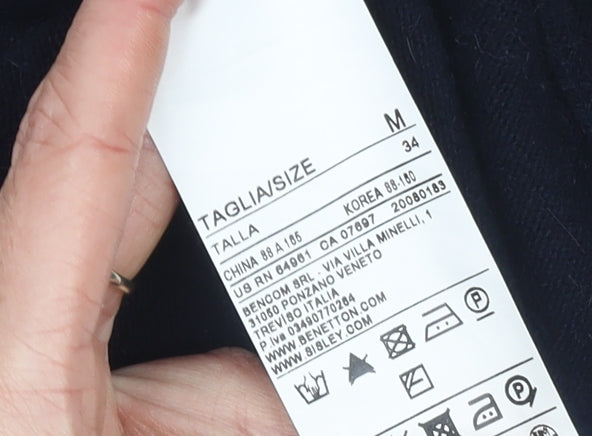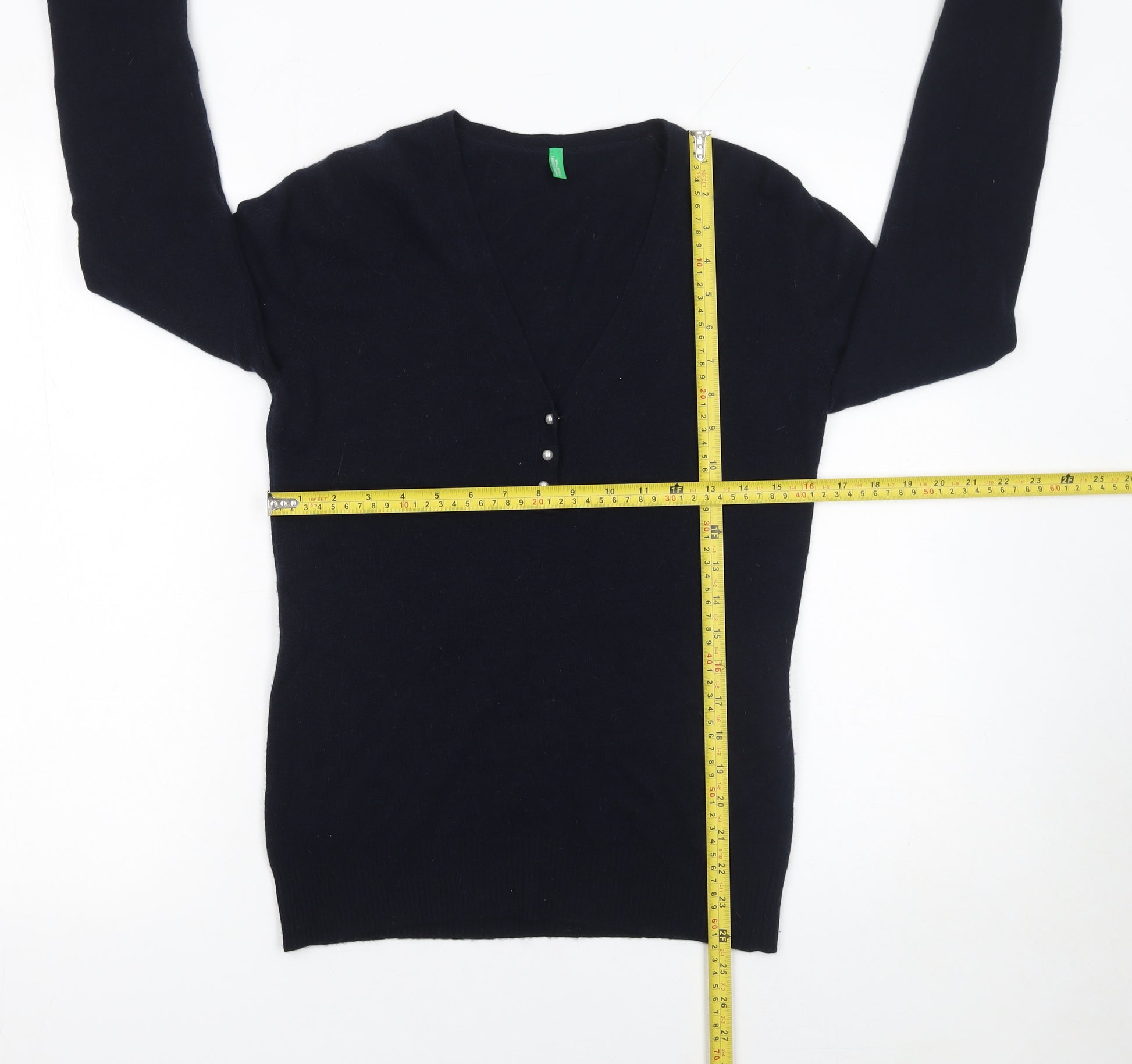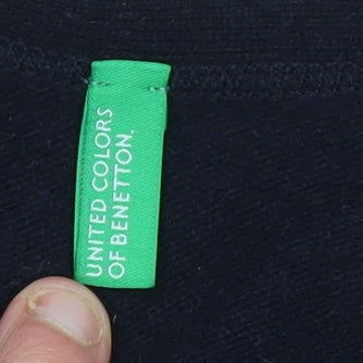 This elegant women’s black V-neck jumper from United Colors of Benetton offers timeless style and comfort for cooler seasons. Crafted from a luxurious blend of wool, nylon, and angora, it provides a soft yet durable feel with natural warmth. Its fine tight-knit construction highlights quality craftsmanship, while the lightweight texture ensures versatile wear, making it perfect for layering or wearing on its own. Designed in a flattering regular fit, it contours comfortably to the body, offering ease of movement without losing shape.The jumper features a minimalist design accentuated by three delicate buttons at the neckline, adding a subtle touch of charm and refinement. Its simple yet sophisticated aesthetic makes it a wardrobe staple that can easily transition from workwear to casual weekend looks. Pair it with tailored trousers for an office ensemble, or wear it with jeans or a skirt for a classic day-out outfit.A long-sleeve pullover construction provides extra warmth during autumn and winter, while the V-neckline complements a variety of styling choices, including collared shirts or layered jewellery. The soft mix of natural wool and angora ensures a cosy, breathable experience, while nylon reinforces the garment for added durability and resilience.In excellent pre-owned condition, showing only minimal signs of gentle wear, this jumper retains its rich black tone and smooth fabric quality. A perfect choice for those seeking elegant simplicity and functionality, this Benetton piece is a stylish, practical addition to any autumn and winter wardrobe. Whether for work, casual outings, or relaxed evenings, this jumper promises warmth, softness, and understated sophistication. A true classic that enhances every outfit with effortless charm and comfort.