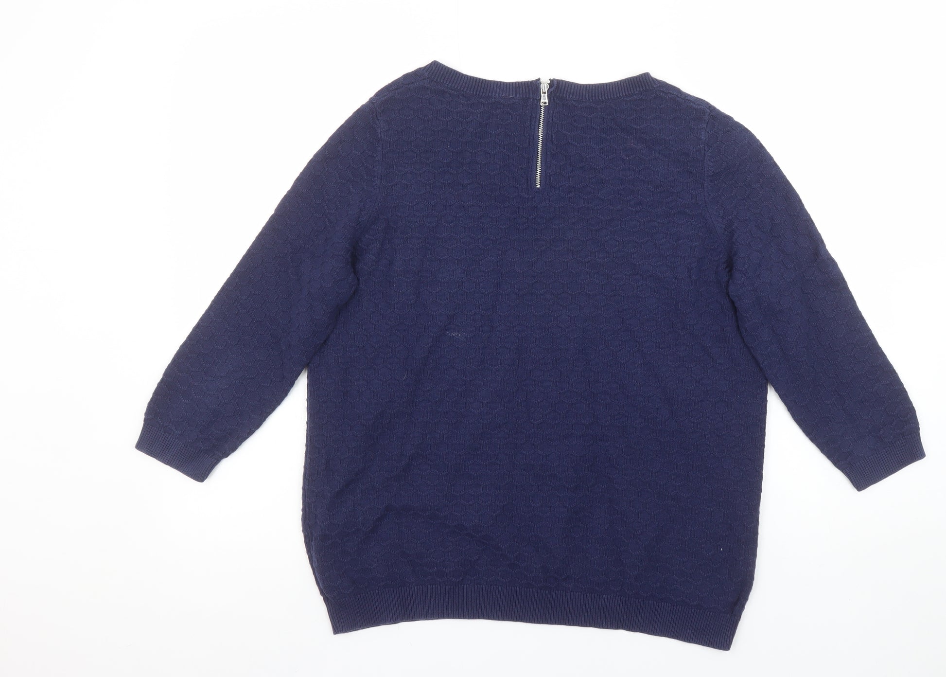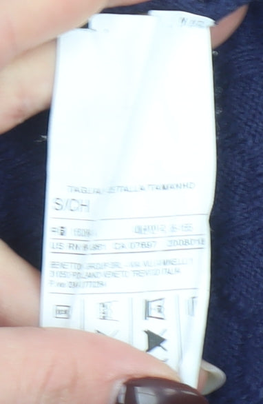 This lovely United Colors of Benetton women’s jumper is a beautifully crafted pullover that combines comfort, style, and everyday wearability. Expertly made from a soft blend of 80% cotton, 18% polyamide, and 2% elastane, it offers breathability with a touch of stretch, ensuring an easy fit that keeps its shape throughout the day. The deep blue colour exudes timeless elegance, making it versatile for year-round outfits. Ideal for layering or wearing on its own, its creative yet subtle honeycomb knit texture provides added depth to its classic silhouette. The jumper features a crew neckline, 3/4 length sleeves, and a neat zip at the back for easy dressing and a sleek finish. Designed for regular fit and midweight comfort, it's perfectly suited for the transitional seasons of spring and autumn, or as a refined layer during winter. Its minimalist design makes it great for casual days out, workwear, or relaxed social occasions. The tight-knit fabric ensures durability and resilience, while the ribbed cuffs and hem keep the shape intact wash after wash. This gently used garment is in excellent condition with only very light signs of previous wear, offering great quality and long-lasting appeal from a well-known brand. Machine washable for easy care, it is a wardrobe essential that effortlessly pairs with jeans, skirts, or trousers. Choose this elegant Benetton blue knit jumper to add a touch of understated sophistication and comfort to your everyday wardrobe — a perfect mix of Italian design and everyday practicality.