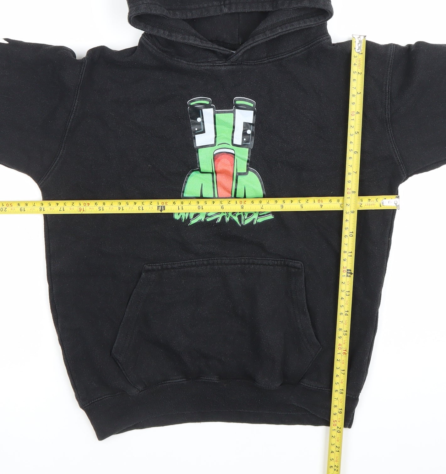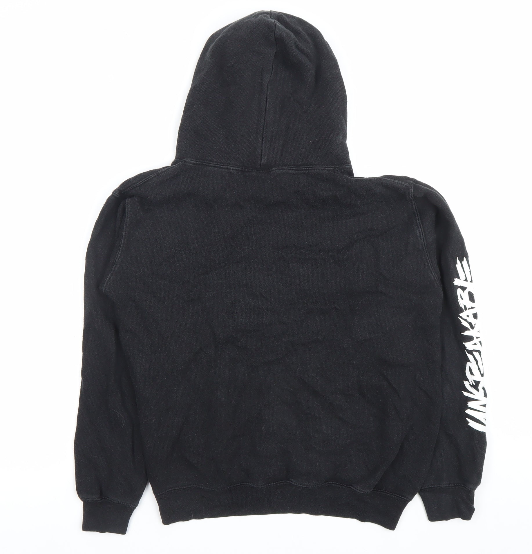 This Unspeakable boys’ hoodie is the ideal casual wear option for kids who love gaming and bold streetwear-inspired style. Crafted from a comfortable blend of 80% cotton and 20% polyester, it offers both softness and durability, ensuring it can be worn time and time again. The fabric is hard-wearing yet breathable, making it practical for school, play, and everyday adventures. The hoodie comes in classic black and is designed with a bold front graphic of the famous Unspeakable frog character, instantly recognisable to fans of gaming and online streaming. The word 'Unspeakable' is printed not only beneath the graphic but also down the sleeve, giving it an extra on-trend accent and eye-catching appeal. Featuring a pullover style with a cosy hood and a front kangaroo pocket, it provides both warmth and functionality – perfect for storing small essentials or keeping hands warm on cooler days. Designed in a regular fit with long sleeves, it ensures comfort without restricting movement, perfectly suited for active kids. The ribbed cuffs and hem help the hoodie stay in place while adding to its durability. This size fits approximately ages 9–10 years, designed to work well for school-age children wanting a fun, comfortable piece of clothing that also reflects their interests.In terms of condition, this hoodie is in very good pre-owned shape with no stains or tears visible, but as there are no original sales tags included, it is not classed as brand new. It remains a great value piece for parents looking for an affordable yet stylish wardrobe addition. Whether worn as a layering piece during colder months or as a lightweight option in the spring/autumn, this graphic hoodie is suitable across multiple seasons. The playful design and comfortable fit make it an excellent choice for casual wear, whether at school, around friends, or gaming at home. A must-have for any young fan of Unspeakable or Minecraft-themed style.