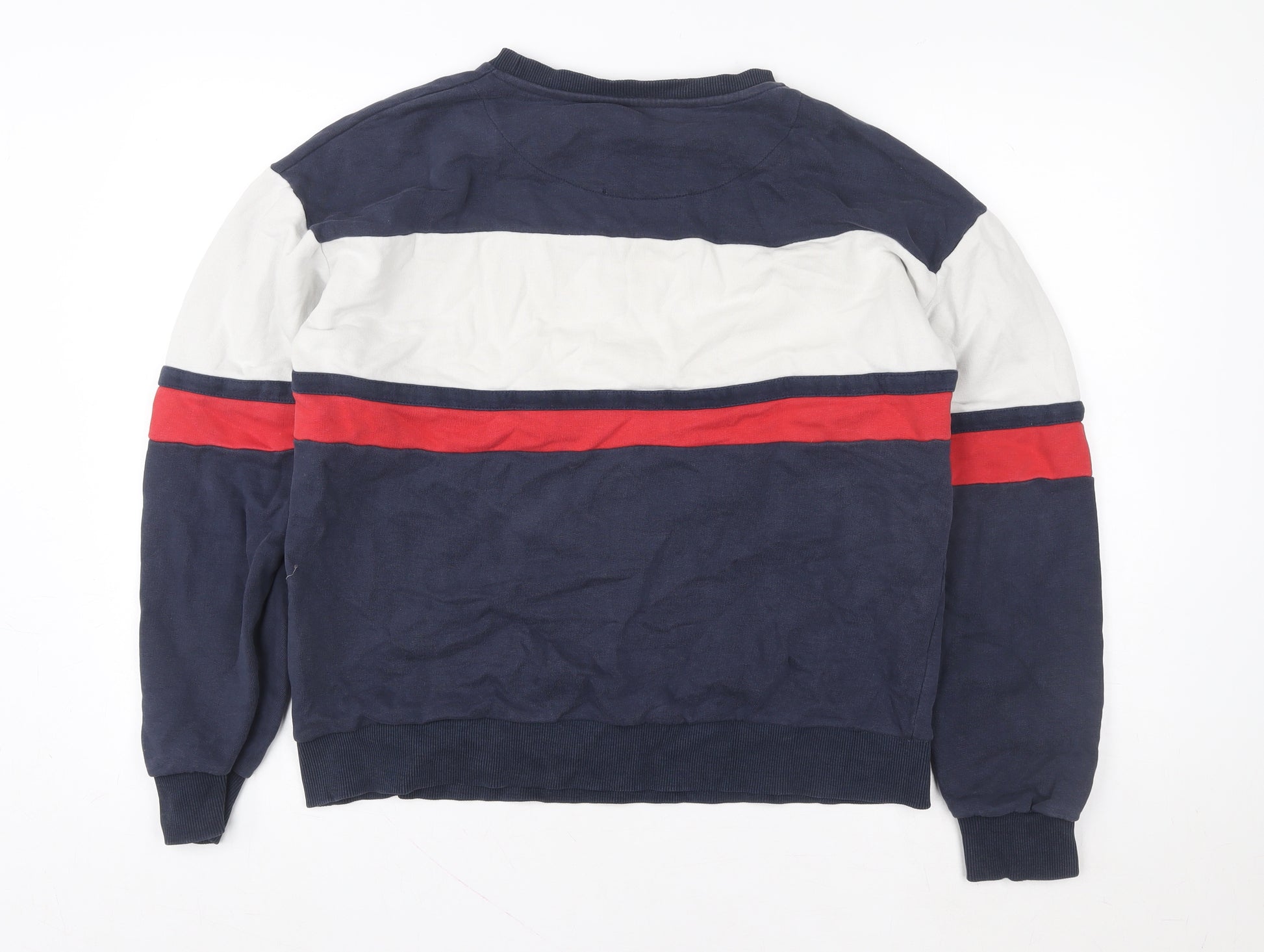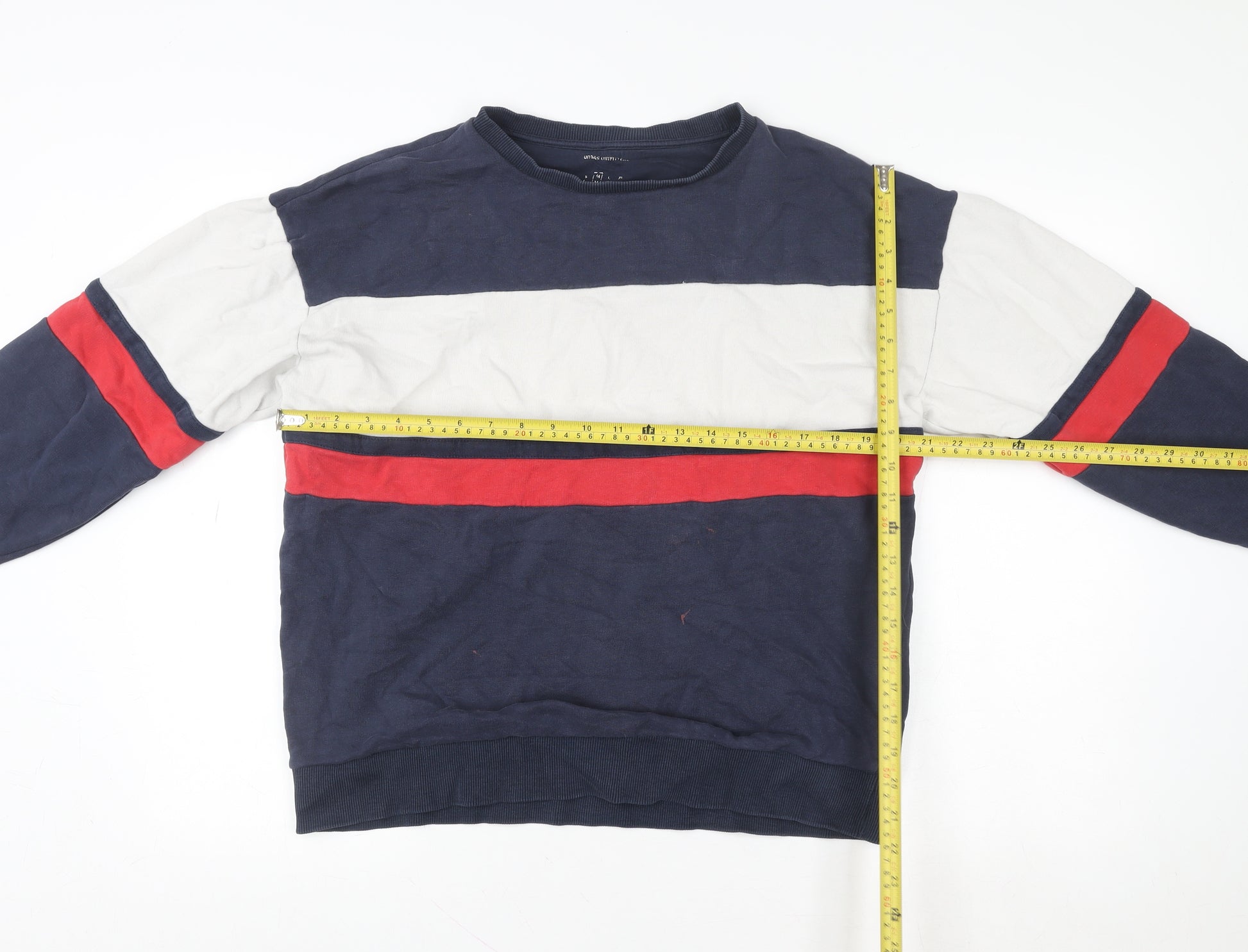 Step up your casual wardrobe with this stylish Urban Outfitters men's pullover sweatshirt featuring a bold retro stripe design in navy blue, white and red. Crafted from a comfortable jersey blend of 85% cotton and 15% polyester, this sweatshirt offers a soft, breathable feel ideal for everyday wear across the seasons. The ribbed crew neck, cuffs and hem provide a classic silhouette that ensures a comfortable and flattering fit. Designed for regular fit wearers, this long sleeve top delivers effortless style whether layered or worn alone. Its minimalist yet eye-catching colour-block pattern channels a timeless, vintage-inspired aesthetic, perfect for pairing with denim, chinos or joggers. This sweatshirt is lightweight yet cosy enough for autumn and winter, while the breathable cotton content makes it versatile for spring days too. With its all-seasons practicality and durable construction, the piece is well-suited for casual outings, weekend relaxation or laid-back social occasions. The design’s simplicity and modern vibe offer a blend of everyday ease and effortless street style appeal. In very good used condition, this navy colourway remains vibrant with only light signs of general wear. Perfect for those who appreciate quality high-street fashion and comfortable design all in one, this Urban Outfitters sweatshirt is a wardrobe staple that exudes relaxed confidence and modern versatility. Machine washable for easy care, it will quickly become a go-to favourite that stands the test of time both in comfort and enduring style.