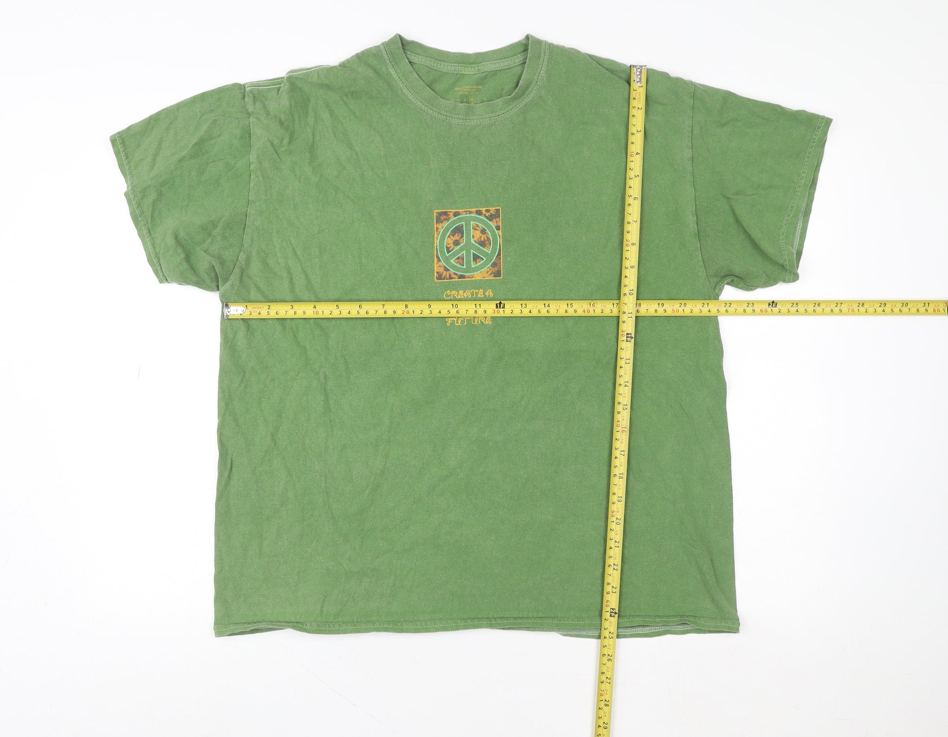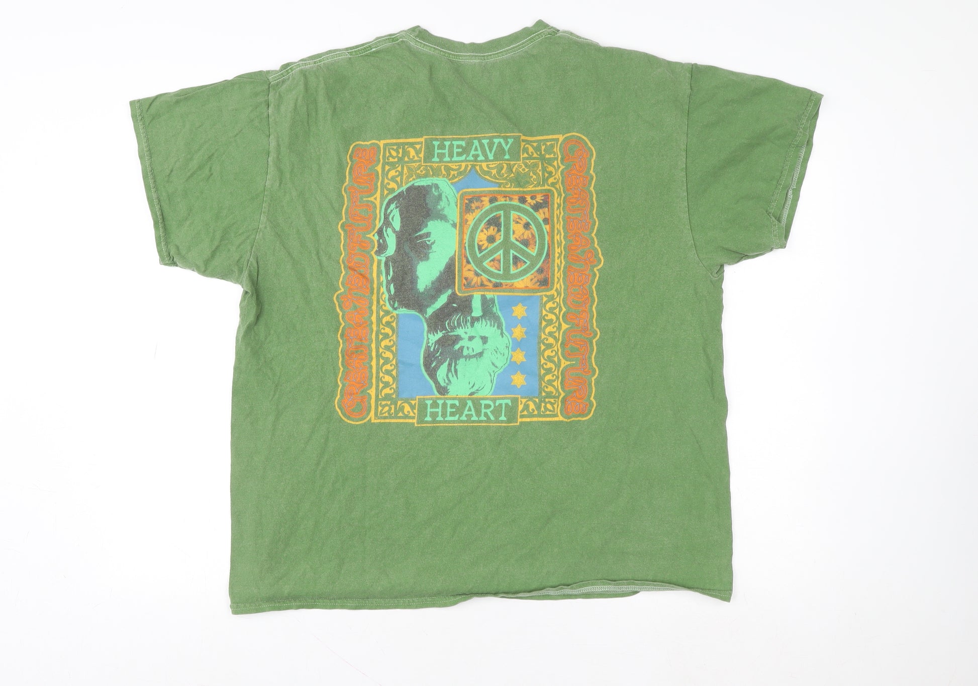 Add a touch of retro charm to your casual wardrobe with this green Urban Outfitters Men’s Oversized T-Shirt. Made from soft 100% cotton jersey, this short sleeve T-shirt offers comfort, breathability and ease of movement, perfect for everyday wear during the warmer months of spring and summer. The front features a bold peace symbol surrounded by a floral-inspired motif with the words 'Create A New Future', while the back showcases an eye-catching oversized graphic design with a pair of artistic faces and peace imagery — reflecting a hippie-inspired aesthetic with a positive, retro twist. The crew neck design keeps things classic, while the relaxed oversized fit ensures a fashionable, laid-back silhouette that draws inspiration from 90s streetwear and festival culture. This T-shirt pairs effortlessly with jeans, shorts, or layered under a jacket for a versatile look that captures the free-spirited vibe of vintage-inspired style. Despite some gentle fading consistent with pre-worn fabric, the condition remains very good with a naturally distressed character that enhances its appeal. Whether for casual outings, concerts, or simply making a statement of peace and individuality, this T-shirt embodies timeless cool with a purpose. Machine washable for easy care, it stands as an ideal blend of comfort, quality, and expressive design — a signature Urban Outfitters piece made to enrich any modern male wardrobe with subtle originality and art-inspired flair.