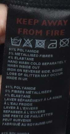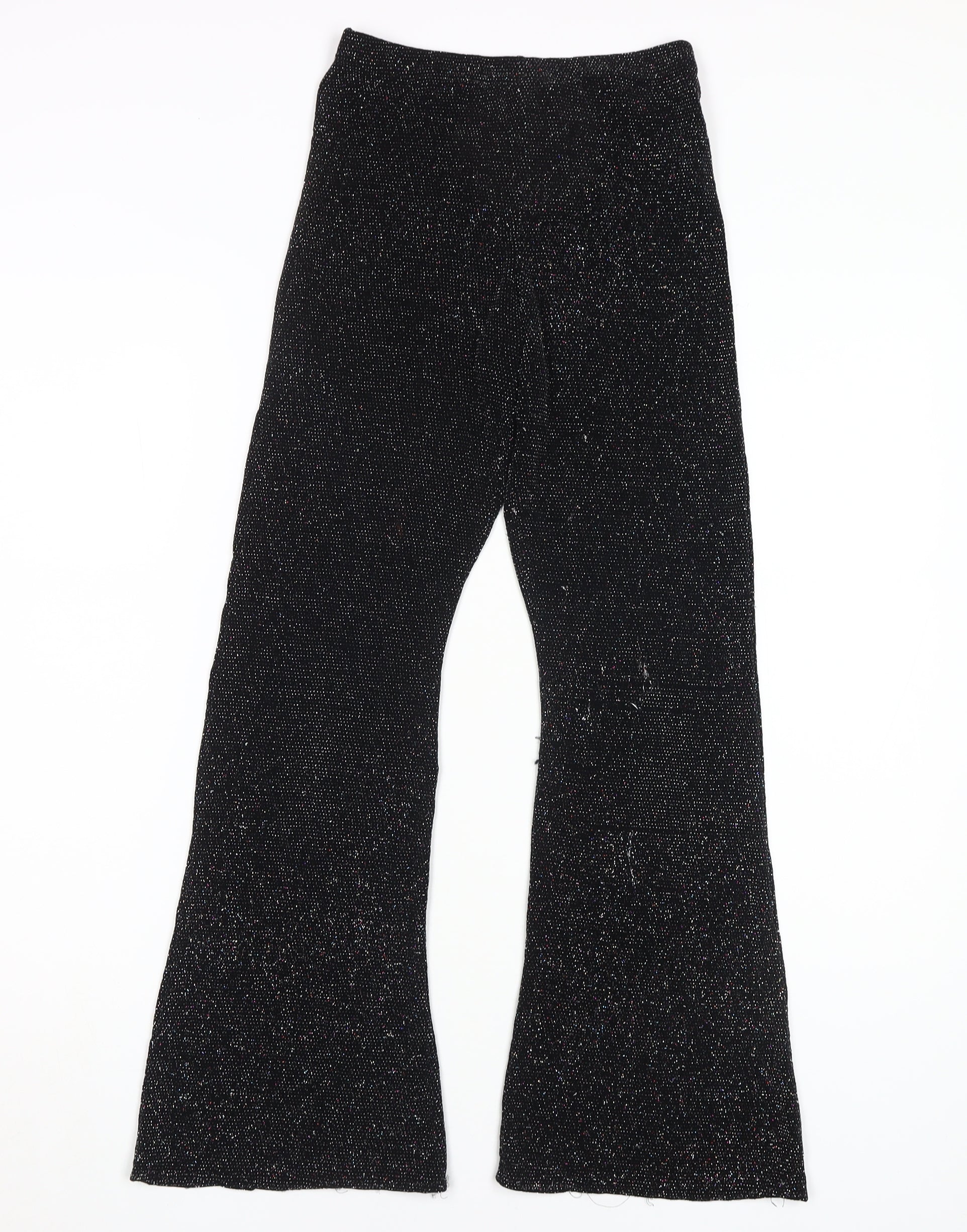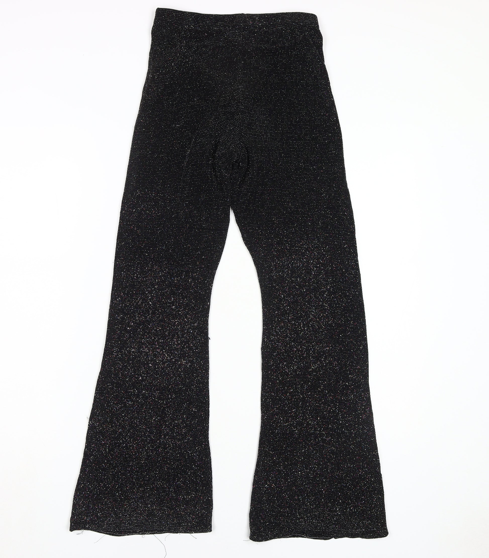 Step into the spotlight with these stunning Urban Outfitters flared trousers. Designed for women who love to make a statement, these trousers are perfect for any party or cocktail occasion. The shimmering black fabric is crafted from a blend of polyamide, metallised fibres, and elastane, providing a sleek and stretchy fit that contours to your silhouette with comfort. The elastic waistband adds ease, ensuring that these trousers fit snugly without causing any discomfort. These trousers shine with subtle glitter accents that sparkle under the light, guaranteed to turn heads wherever you go. With their regular fit, they offer the perfect balance between style and comfort, making them an essential addition to your wardrobe. Pair them with your favourite top and heels for a show-stopping look that's both elegant and contemporary. Made with care and attention to detail, they feature hand wash instructions to keep them looking as new as the first wear. Whether it's a festive gathering or a night out on the town, these Urban Outfitters trousers will have you stepping out with confidence. Don’t miss your chance to own a pair that merges striking appearance with versatility.