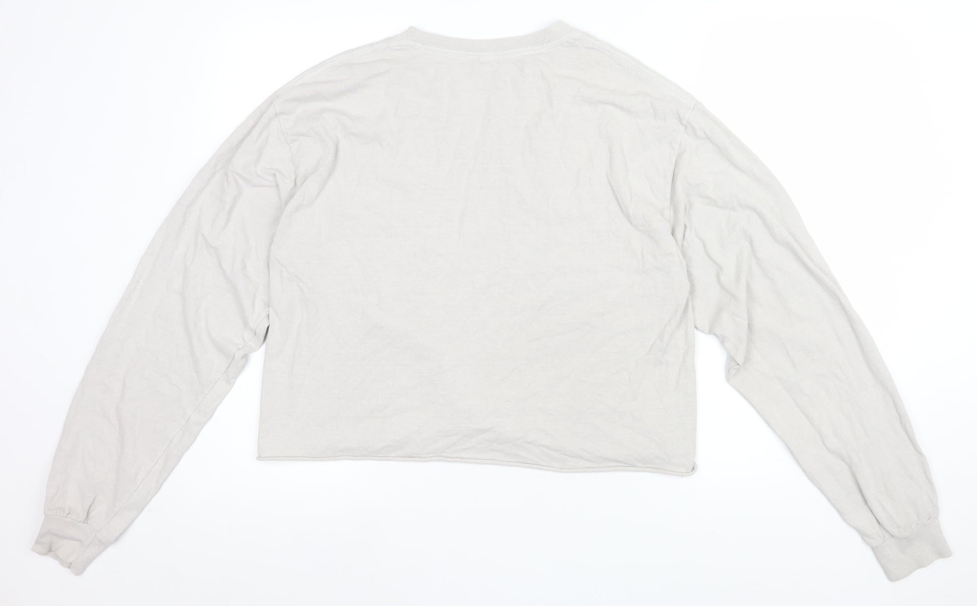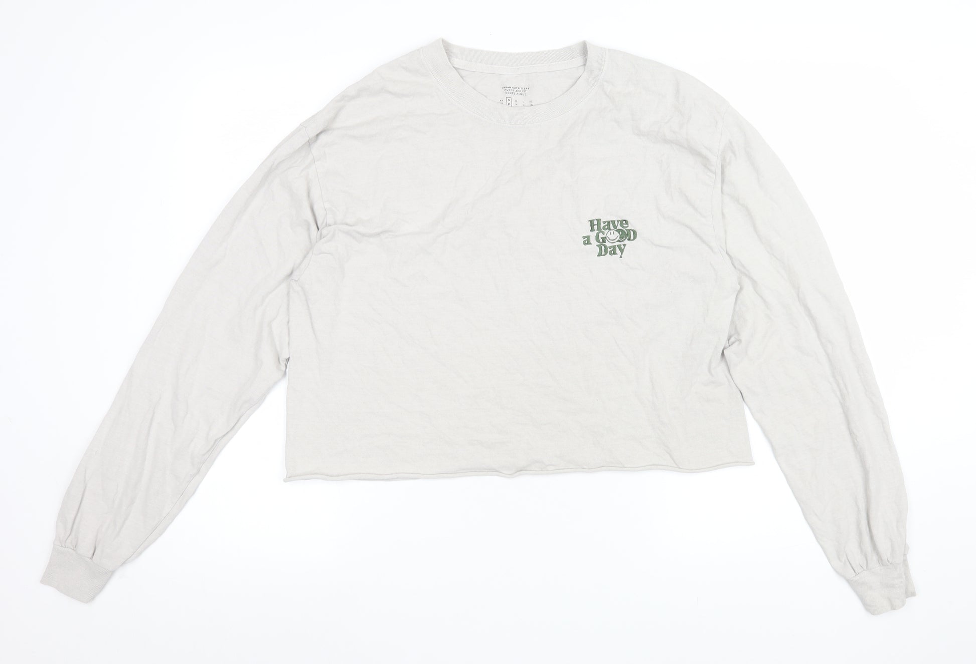 This Urban Outfitters women's long sleeve T-shirt is a casual yet effortlessly chic piece perfect for everyday wear. Designed in a clean white shade, the top features a relaxed oversized fit with a slightly cropped cut that adds a trendy twist to a classic silhouette. Crafted from soft and breathable 100% cotton jersey, it ensures all-day comfort while maintaining a lightweight feel. The front features a minimal ‘Have a Good Day’ printed detail in green, bringing a touch of personality to the design without overwhelming its simplicity. The long sleeves with fitted cuffs provide a cosy and flattering fit, ideal for layering under jackets or pairing with jeans and skirts across multiple seasons. The crew neckline maintains a timeless appeal and makes the shirt easy to style for laid-back outings, lounging, or casual get-togethers. Its pullover style ensures effortless wearability, and the natural cotton material promotes breathability, making it perfect for spring, summer, or early autumn. In excellent pre-owned condition, this garment shows no visible flaws beyond light creasing from storage, adding to its easygoing look. Its combination of comfort and understated design makes it a versatile staple for any wardrobe. Whether tucked into high-waisted trousers for a vintage look or worn loose with joggers for a relaxed fit, this long sleeve top captures the casual-cool aesthetic that Urban Outfitters is loved for. A simple yet stylish essential, this cropped tee offers both comfort and individual flair — ideal for anyone who values easy fashion with a positive vibe.