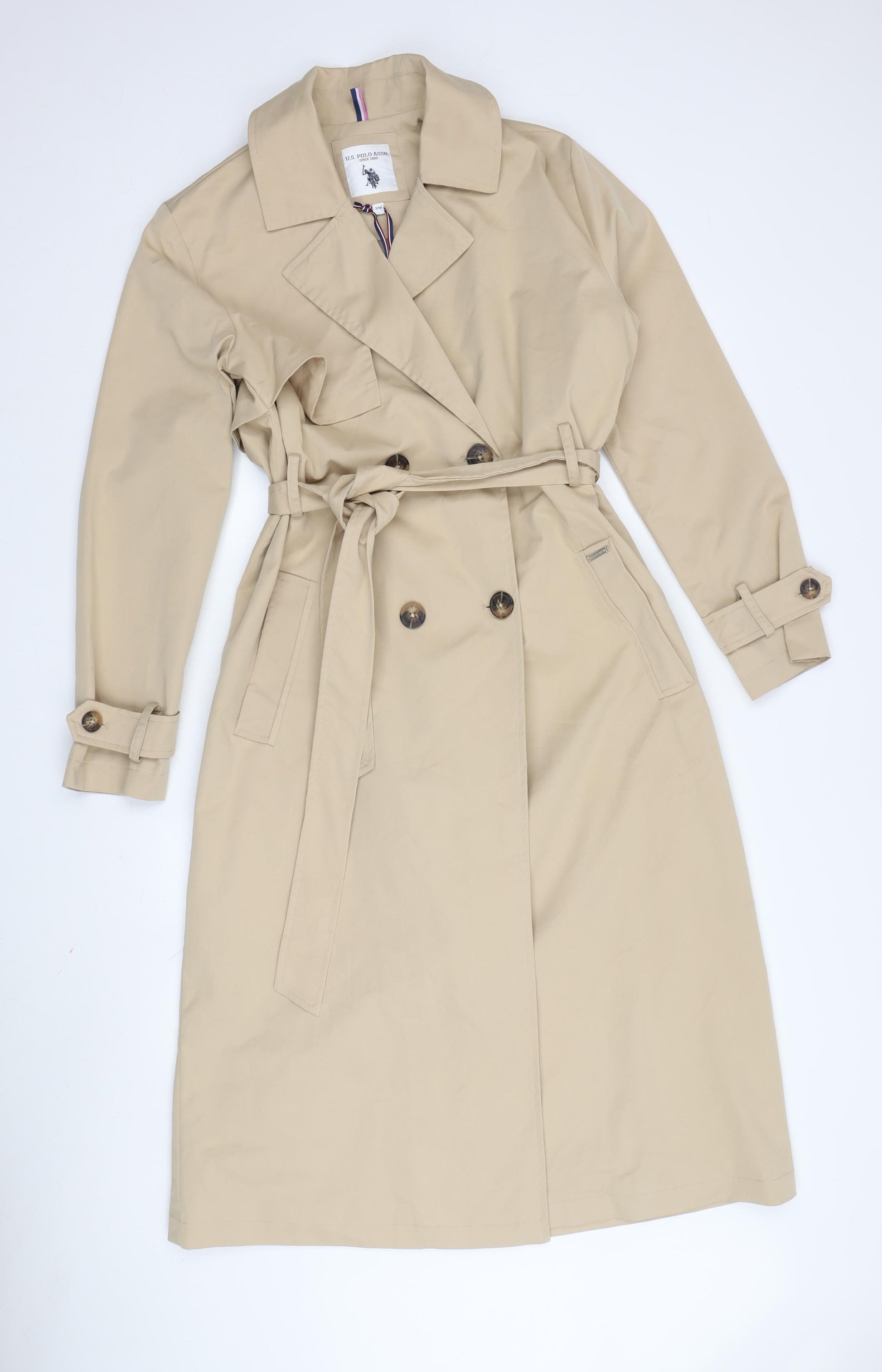 This sophisticated U.S. Polo Assn. trench coat, tailored for women, combines elegance with practicality. Made from a blend of cotton and elastomultiester, it ensures comfort and durability. Its classic beige shade makes it versatile for both business and casual occasions, making it a staple for any wardrobe. The coat features a collared neckline and is belted at the waist, offering a flattering silhouette for any body type. The long length and button accents add a touch of timeless style. Suitable for autumn and spring, this coat is ideal for layering over any outfit. Whether you're heading to an office meeting or a casual outing, this trench coat will keep you looking chic and polished. The regular fit and machine washable care make it easy to maintain, while the excellent condition ensures it retains its quality look. Don't miss out on adding this classic trench coat to your collection.