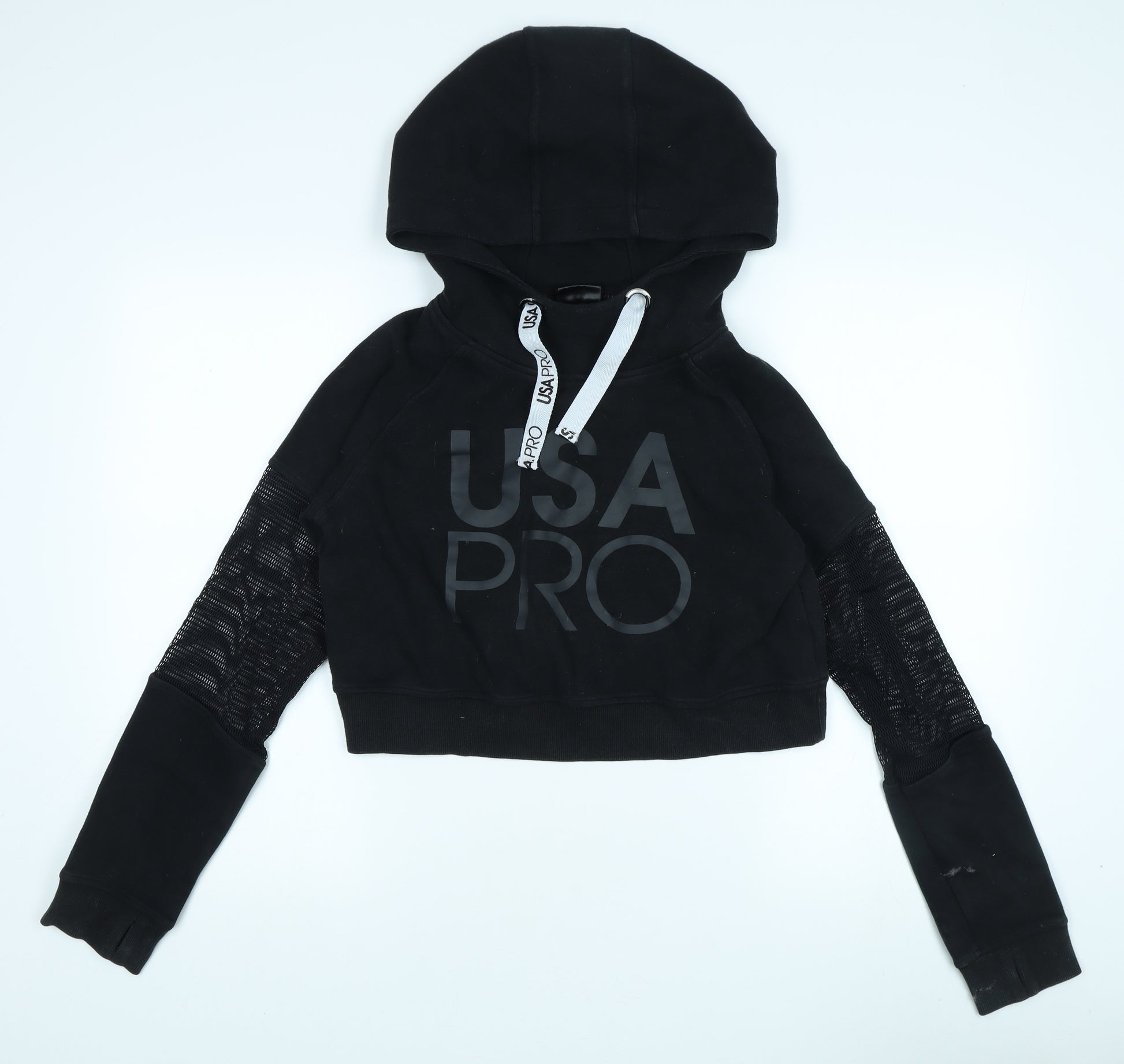 Step up your activewear with the USA Pro Women's Black Pullover Hoodie. Designed for both comfort and style, this hoodie features a classic crew neck design with long raglan sleeves for added ease of movement. The sleek black colour is highlighted by the sporty USA Pro logo, making it a versatile addition to any wardrobe. Crafted from a blend of cotton, polyester, nylon, and elastane, it ensures comfort with a soft jersey fabric, while providing stretch and durability for your gym training sessions. Easily machine washable, this hoodie offers practicality and style for all seasons. The hooded design and graphic print further accentuate its sporty theme, making it perfect for casual outings or a workout session. Stay ahead in the fashion game with its regular fit and stylish look that complements any casual outfit.