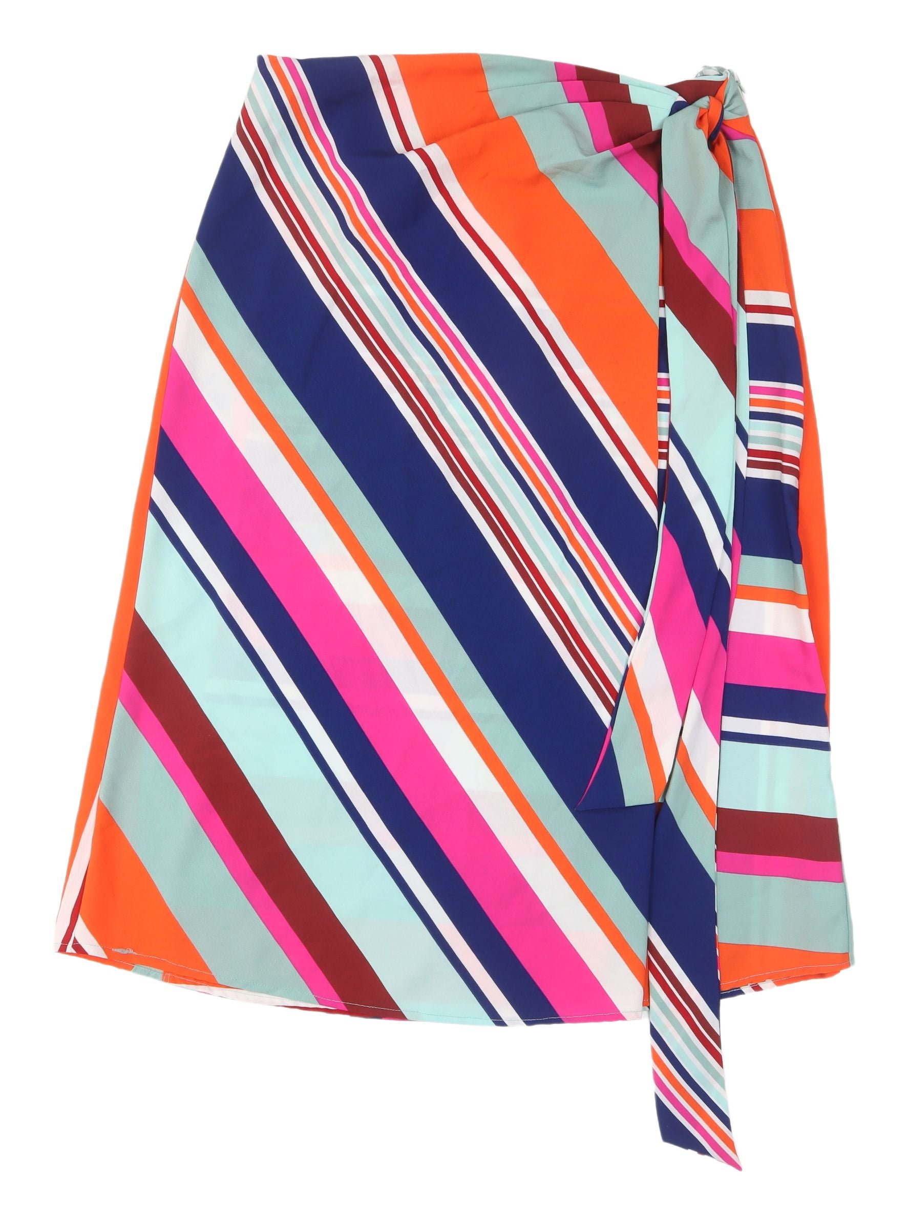 Step out in style with this vibrant V by Very multicoloured striped wrap skirt, perfect for adding a pop of colour to your wardrobe. Designed in a flattering knee-length and adding a contemporary twist with a chic wrap style, this skirt effortlessly combines fashion with comfort. Made from 100% polyester, the fabric ensures a light and airy feel, ideal for casual occasions. The regular size 14 fit makes it a versatile piece for everyday wear. Featuring a tie closure, this skirt provides a secure yet adjustable fit, allowing you to style it at your preference. The playful striped pattern in a mix of bold and soft colours ensures you stand out, while the machine washable material guarantees easy care. Pair this skirt with a solid-colour top and boots for a stylish, everyday look. Elevate your wardrobe with this eye-catching piece from V by Very, brand new with tags, ensuring the highest quality and freshness.
