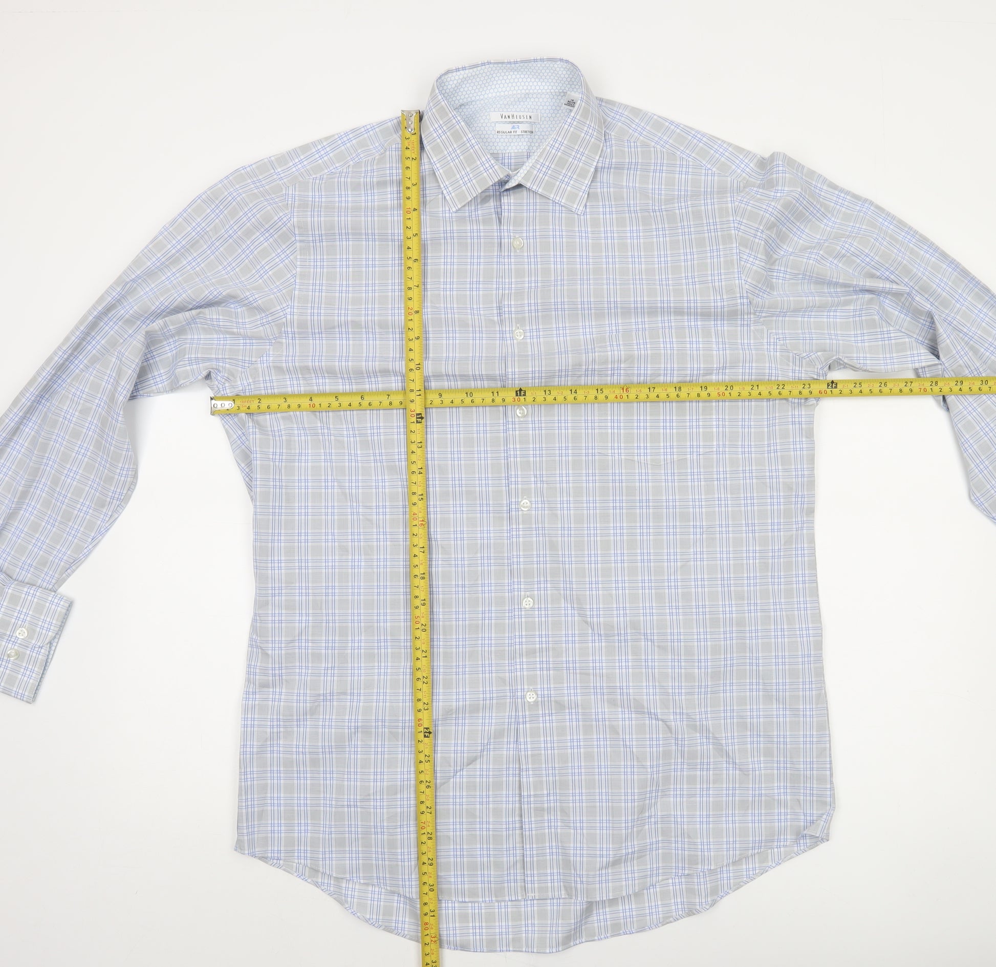 This Van Heusen men's formal shirt combines timeless style with modern comfort, making it the perfect choice for business or formal occasions. Crafted from a soft and breathable cotton blend with a touch of elastane, this shirt offers a comfortable stretch that ensures ease of movement throughout the day. The subtle blue check pattern adds a refined detail without overwhelming your look, striking the right balance between modern sophistication and classic appeal. Designed in a Regular Fit, it provides a flattering yet comfortable silhouette suitable for most body types. The shirt features a collared neckline with a point collar, a full button front closure, and long sleeves finished with barrel cuffs—ideal for pairing with both ties and cufflinks. The woven fabric construction ensures durability and a smooth finish, maintaining a crisp appearance all day long. Key features include its easy-care composition and non-restrictive stretch feel, allowing this piece to transition seamlessly from workwear to smart evening wear. The pure blue check design makes it versatile to coordinate with both neutral and bold-coloured trousers or suits, while the breathable cotton construction guarantees comfort even during warmer days. This shirt is in excellent pre-owned condition, showing only light signs of use with no visible flaws. Perfect for those who value high-quality tailoring and smart presentation. Machine washable for convenience, this Van Heusen shirt maintains its shape and detail wash after wash. Tailored for the modern gentleman, this piece embodies understated elegance and reliable wearability, offering style that works whether you’re heading to the office, attending a formal event, or dressing up for special occasions. Add a touch of trusted Van Heusen craftsmanship to your wardrobe with this distinctive yet versatile blue check formal shirt.