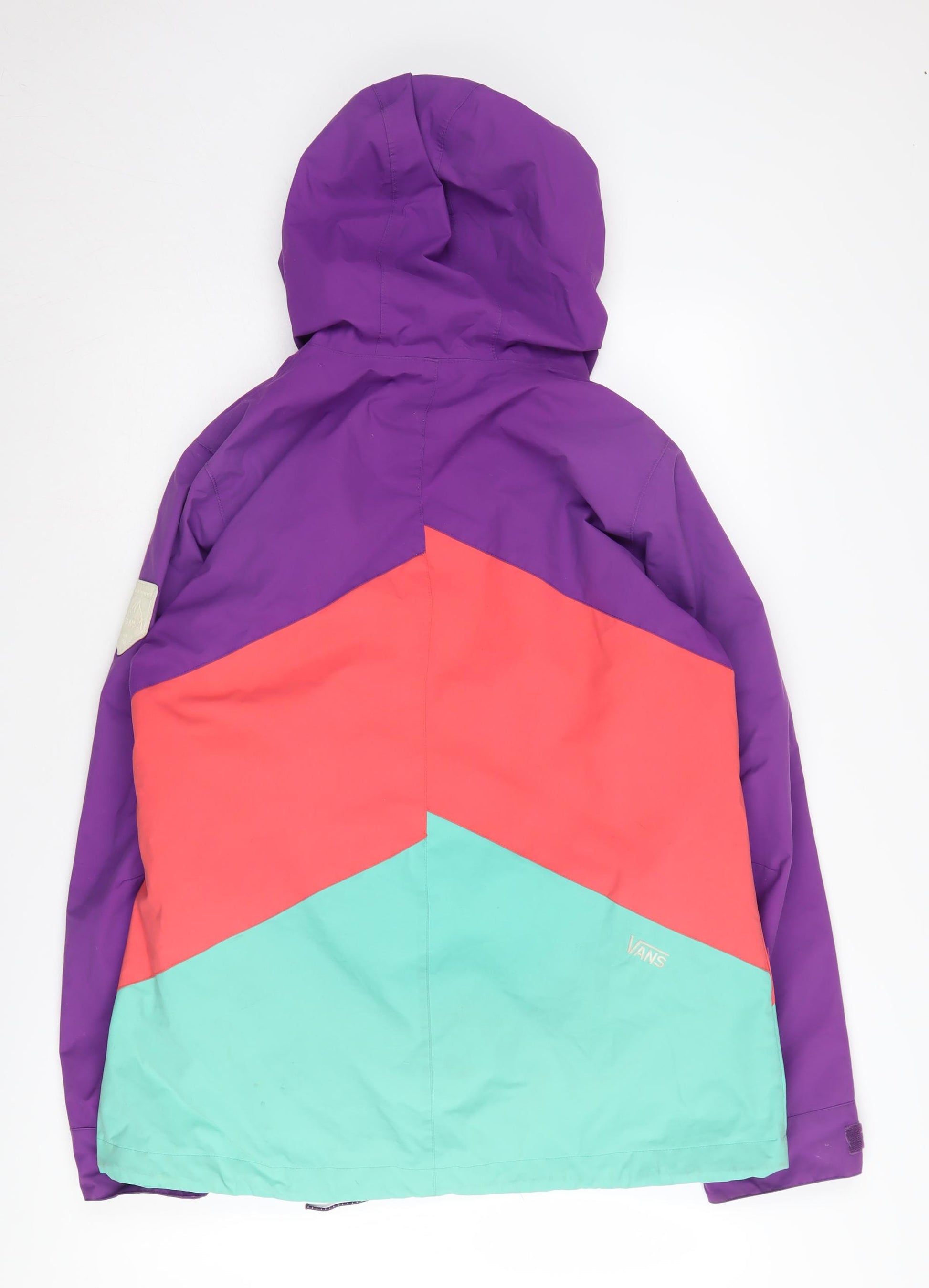 Elevate your winter wardrobe with this vibrant Vans Women's Puffer Jacket. Featuring a striking geometric design in purple, coral and mint, this jacket is perfect for adding a pop of colour to chilly days. Constructed from durable nylon with a synthetic filling, it promises warmth and comfort throughout the winter season. The hooded style offers extra protection against the elements, making it ideal for casual, everyday wear. The jacket boasts handy zip pockets for secure storage of essentials, while the relaxed fit ensures easy layering over your favourite jumpers. Its mid-length cut and softshell fabric provide both style and functionality, letting you stay active without compromise. Whether you're heading out for a walk or enjoying a laid-back day out, this jacket is your go-to choice. The playful 90s theme and sporty vibe make it a must-have for fashion-forward individuals looking to stand out. Despite slight marks on the lower front, it's in very good condition, ensuring many more enjoyable wears. Don't miss the chance to enhance your outerwear collection with this dynamic and versatile piece.