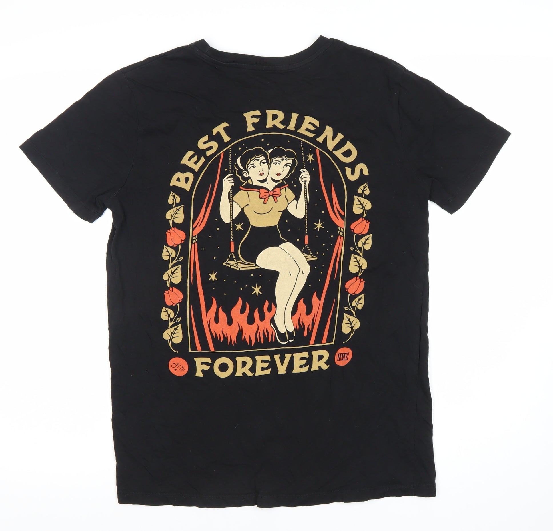 Unveil your unique style with this striking men's T-shirt from Velani Studio, designed to captivate with its distinctive retro and tattoo-inspired graphics. Fabricated from 100% cotton, it promises comfort and breathability, an essential choice for everyday wear. The T-shirt arrives in a timeless black hue, making it a versatile piece in any wardrobe, suitable for various occasions and matching effortlessly with numerous outfits.Its crew neck and short sleeve silhouette offer a classic yet contemporary fit that aligns with today's fashion standards. Adorned with an alluring graphic print, featuring the bold 'Best Friends Forever' design on the back and a captivating heart with an eye motif on the front, this T-shirt defines statement-making apparel. Its rich visuals are further complimented by the subtle artistry of stars and themed rose embellishments, reflecting a perfect blend of art and style.Though lightly worn, the garment is in excellent condition with minimal signs of wear, ensuring it retains its charm and appeal. The slightly faded print adds a character-rich, lived-in look, appealing to vintage and modern aesthetics alike. Machine washable for easy maintenance, it fits seamlessly into a busy lifestyle while preserving its quality.An ideal pick for any season, this T-shirt suits casual outings or relaxed gatherings, ensuring you're noticed for your eclectic fashion taste. Elevate your collection with a piece that stands out, yet provides the versatility your closet demands. Discover the art of self-expression through fashion with this Velani Studio creation, and step out with confidence knowing you're sporting an avant-garde design.Secure this piece today and redefine comfort and style in one wear.