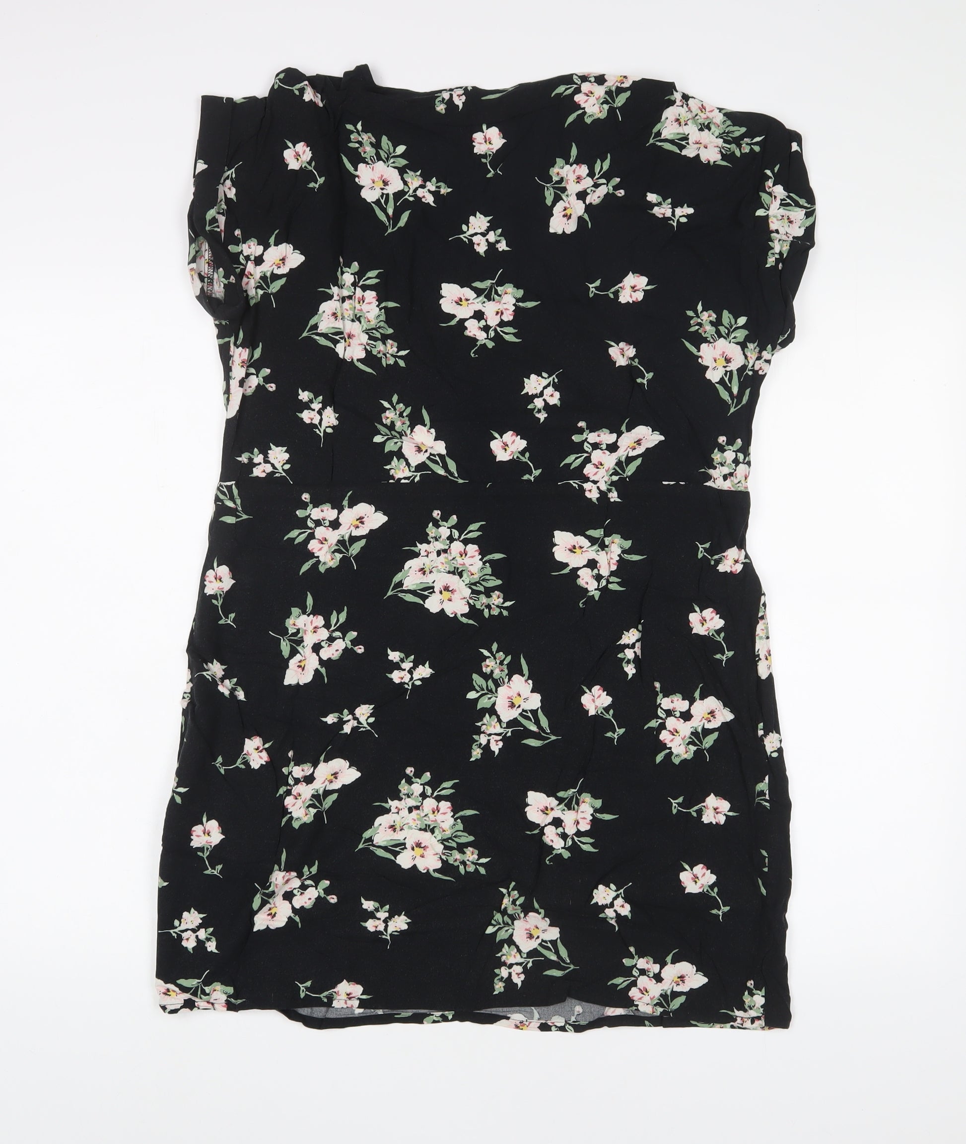 Womens Black Floral Viscose A-Line Size L Crew Neck Pullover - Drawstring