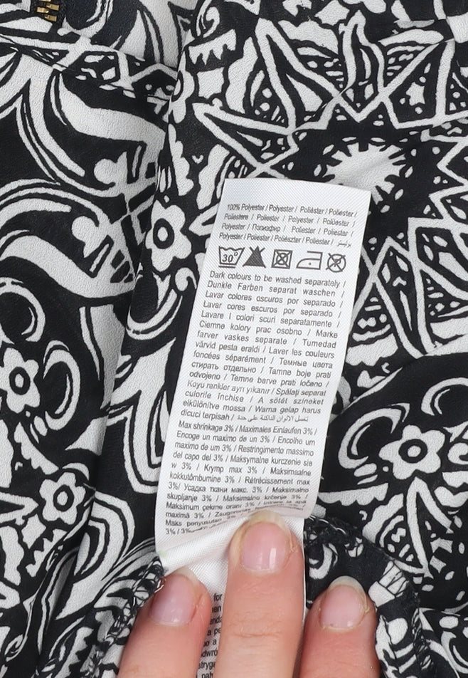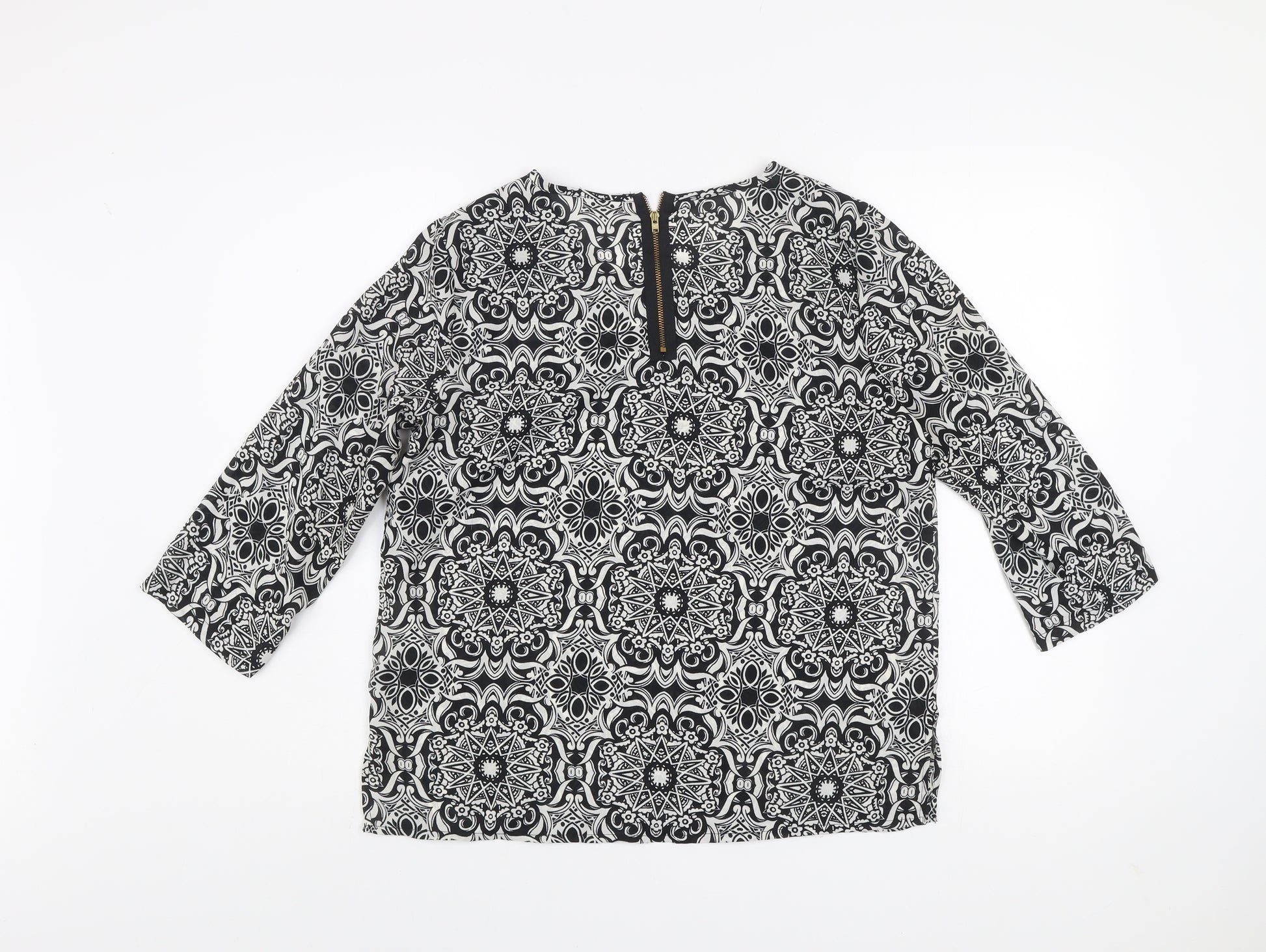 This striking Vero Moda women's black and white geometric print blouse brings a stylish edge to everyday dressing. Crafted from 100% polyester, the woven fabric provides a smooth drape and lightweight feel that makes it a versatile choice for transitional weather. The boat neckline and three-quarter sleeves add a relaxed yet polished silhouette, perfect for both professional and casual occasions. The back zip closure offers a neat finish, balancing practicality with a touch of contemporary detailing. Designed with a regular fit, this tunic-style blouse pairs easily with jeans, tailored trousers, or a sleek pencil skirt, making it a flexible piece for day-to-night wear. The monochrome geometric pattern adds a modern, chic statement, while the durable woven polyester ensures easy maintenance and longevity. Machine washable and ideal for spring through autumn, this top is low effort yet high impact. In excellent condition with no visible signs of wear, it’s ready to refresh your wardrobe with instant sophistication. Perfect for workwear or weekend outings, this blouse offers effortless elegance with reliable comfort and style. A fantastic choice for anyone seeking a versatile piece from Vero Moda known for its trend-led yet timeless designs.