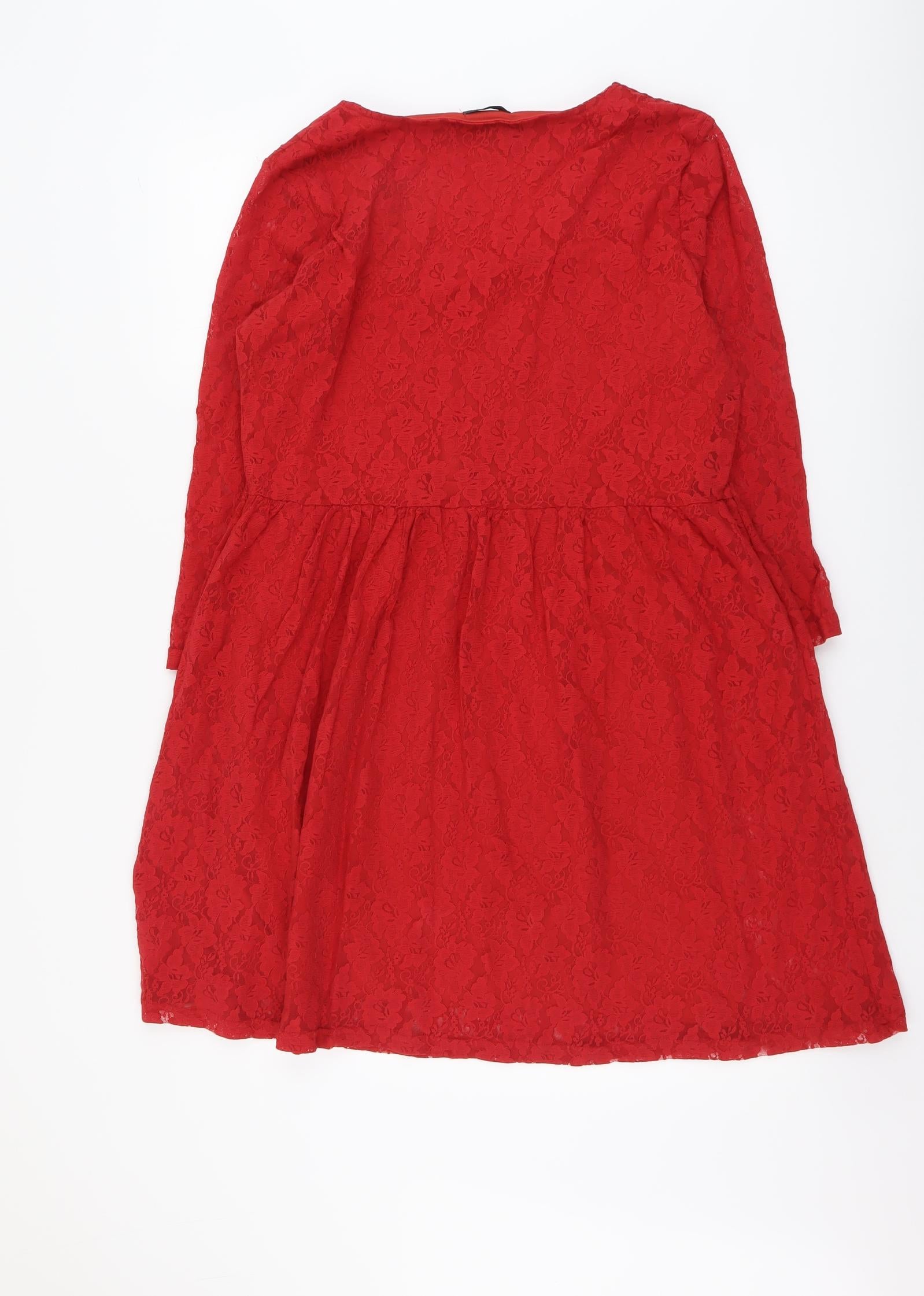 Womens Red Geometric Polyester Fit & Flare Size XL Round Neck Pullover