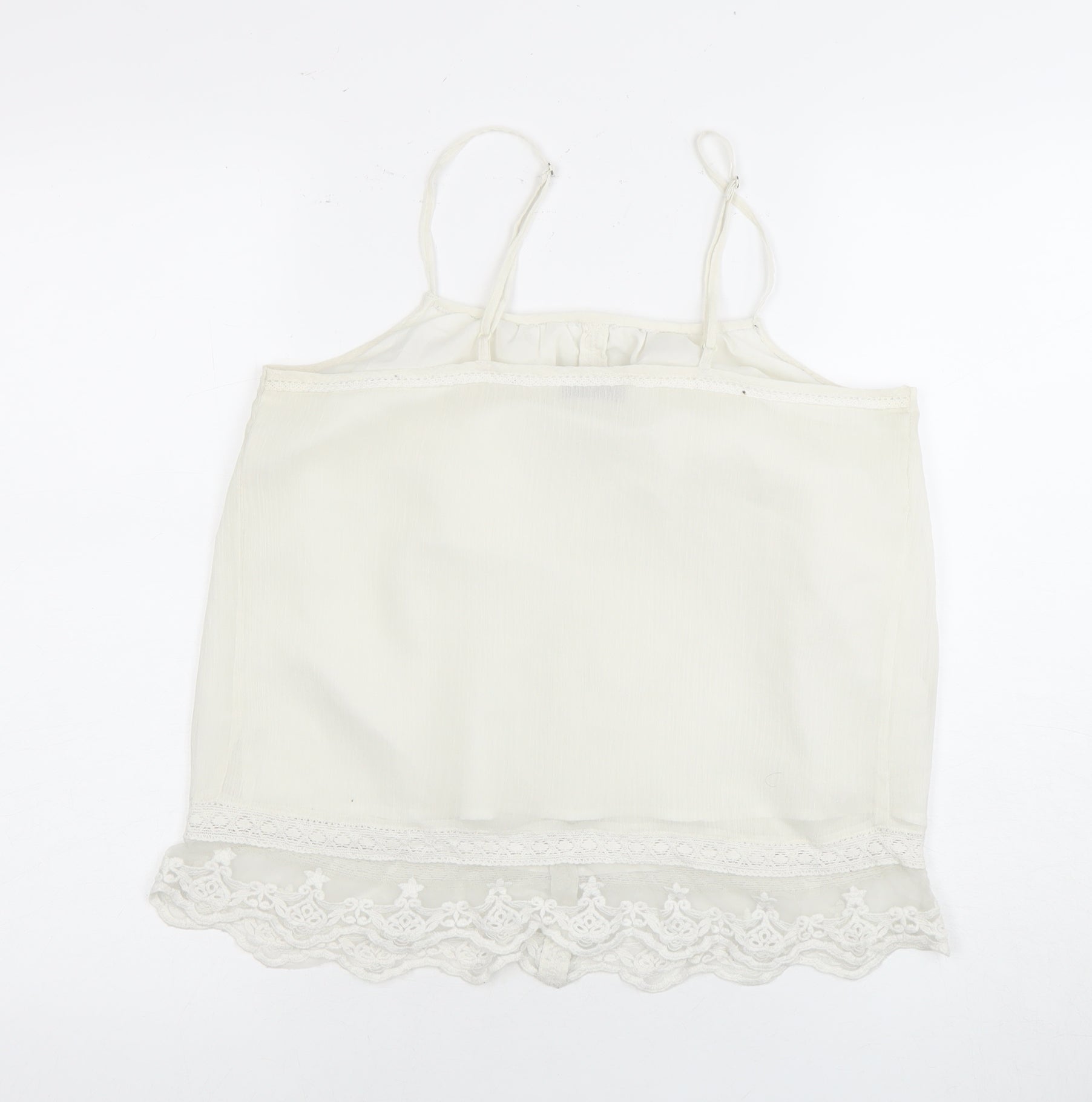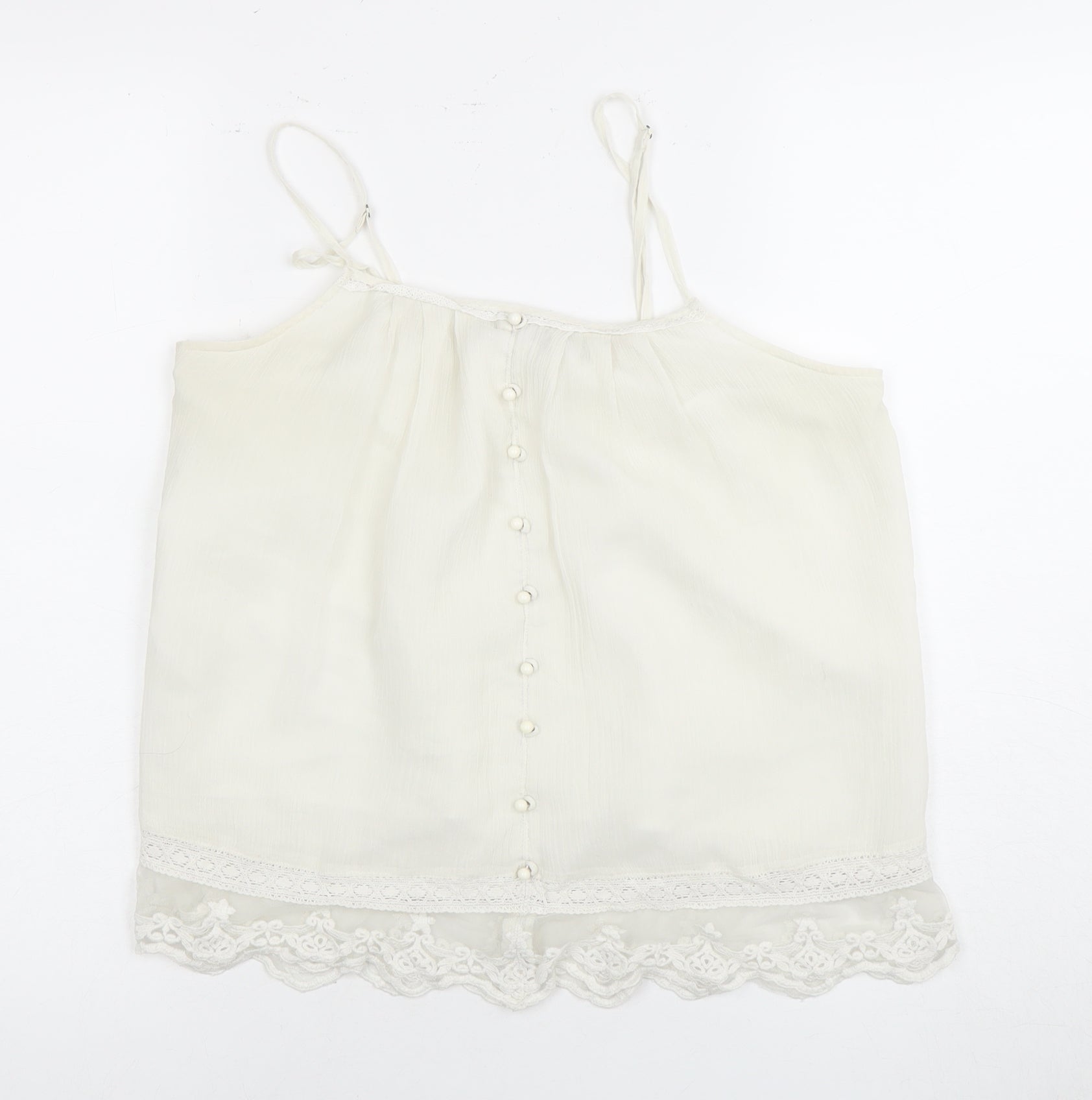 Elevate your summer wardrobe with this elegant Vero Moda camisole, perfect for casual outings. This stylish piece, available in size M, is tailored from a luxurious white fabric and features a sophisticated scoop neckline that adds a touch of elegance to your ensemble. The subtle button accents along the back enhance its chic appeal, making it a versatile addition to your collection. Crafted with delicate spaghetti straps, this camisole is suitable for spring and summer, offering a comfortable fit and an effortless look. Its solid pattern and regular fit ensure it can be paired with various bottoms, from jeans to skirts, offering a versatile styling option. Though pre-loved, it remains in excellent condition with a slightly worn texture, offering authenticity without damage. Perfect for casual occasions, this top is a staple piece that will complement your style and keep you comfortable throughout the day. Don't miss out on adding this Vero Moda camisole to your wardrobe, blending fashion and comfort seamlessly at an unbeatable price.