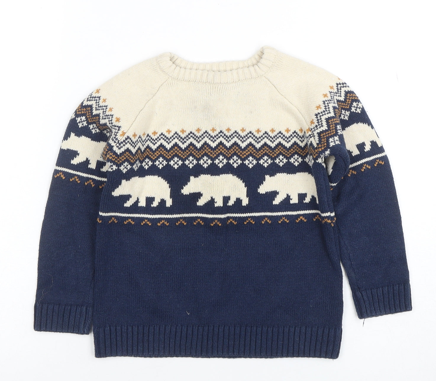 Keep your little one cosy and stylish with this charming Vertbaudet Boys Blue Fair Isle Bear Knit Jumper. Crafted from a soft and breathable cotton-acrylic blend, the jumper is perfect for cooler days and provides comfortable wear without bulk. The eye-catching Fair Isle pattern, complete with contrasting cream and brown tones and playful bear motifs, adds a delightful winter charm to your child’s everyday wardrobe. Designed as a pullover style, it features a classic crew neckline and snug ribbed trims on the cuffs and hem for a secure, comfortable fit.The jumper’s mid-weight knit makes it perfect for layering over shirts or under jackets during the autumn and winter months. Whether it’s worn for festive family gatherings, casual weekends, or relaxed school days, this jumper combines warmth with timeless seasonal appeal. The durable construction and easy machine washable fabric ensure it stays looking great after every wear.In excellent pre-loved condition, this Vertbaudet jumper shows minimal signs of use and maintains its colour and shape beautifully. The soft knitted fabric ensures a warm yet breathable feel, making it ideal for active young adventurers. Subtle ribbed details at the collar, hem and sleeves add both texture and durability, while the high-quality materials mean it’s built to last.Perfectly balancing comfort and style, this boys’ jumper effortlessly captures the spirit of cosy winter fashion. Pair it with jeans or chinos and boots for a charming seasonal look that will never go out of style. An authentic Vertbaudet piece known for its attention to detail and quality craftsmanship, this jumper is sure to become a favourite in any child’s wardrobe.