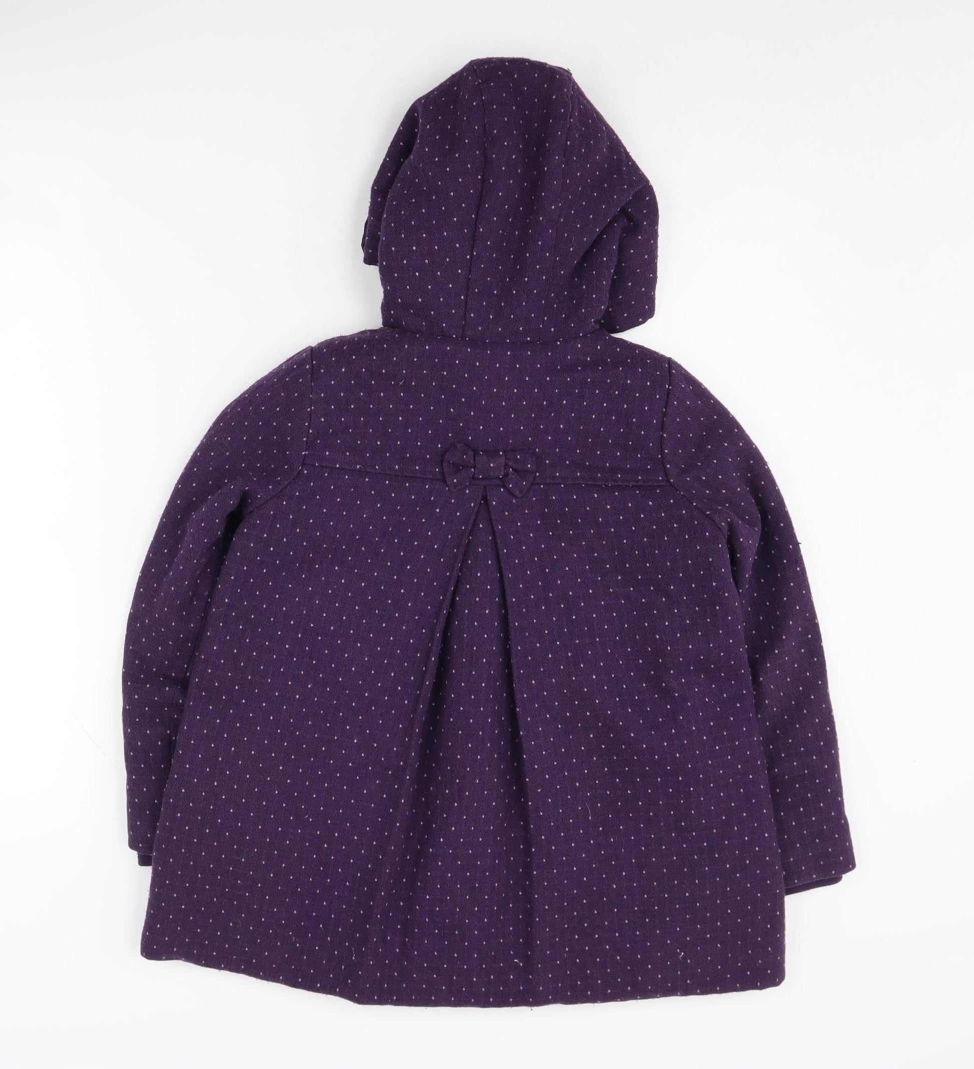 Keep your little one snug and stylish with this Vertbaudet Girls Purple Hooded Coat. Crafted for warmth and comfort, this mid-length winter coat is made from a blend of polyester, acrylic, wool, polyamide, and viscose. Its soft woven fabric is accented by charming polka dots and a delightful bow, making it a perfect pick for casual occasions. Featuring a cosy hood and lined interior, it ensures day-long comfort against the chill. Button closure adds a classic touch, while the long sleeves provide essential coverage. Ideal for girls aged 8, this coat is machine washable for easy care. Although gently used, it remains in excellent condition, ready to bring warmth and cheer to your child's winter wardrobe.