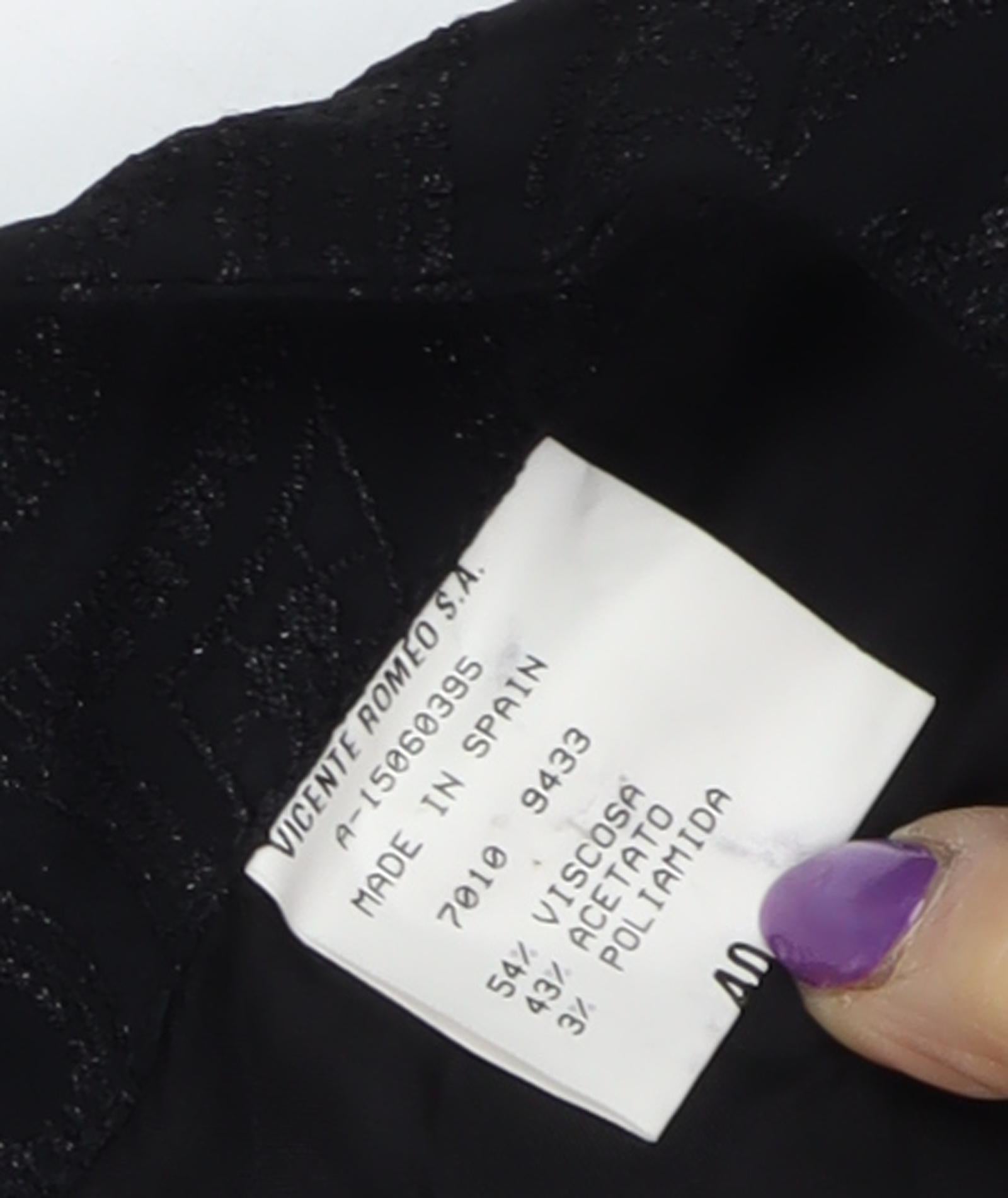 Elevate your wardrobe with this elegant Vicente Romero skirt. Crafted in Spain, this knee-length skirt features a rich black colour that's perfect for any formal occasion. Made from a sophisticated blend of viscose, acetate, and polyamide, it offers a luxurious feel and a flattering drape. The subtle pattern and exquisite design make it a versatile piece, seamlessly pairing with your favourite blouses and jackets for a chic ensemble. Ideal for women looking for a stylish addition to their formal wear collection, this skirt strikes the perfect balance between comfort and elegance. Its condition remains excellent, showcasing minimal signs of wear. Perfect for dinners, business meetings, or elegant evening events, this skirt is a must-have for anyone seeking timeless sophistication with a modern edge.