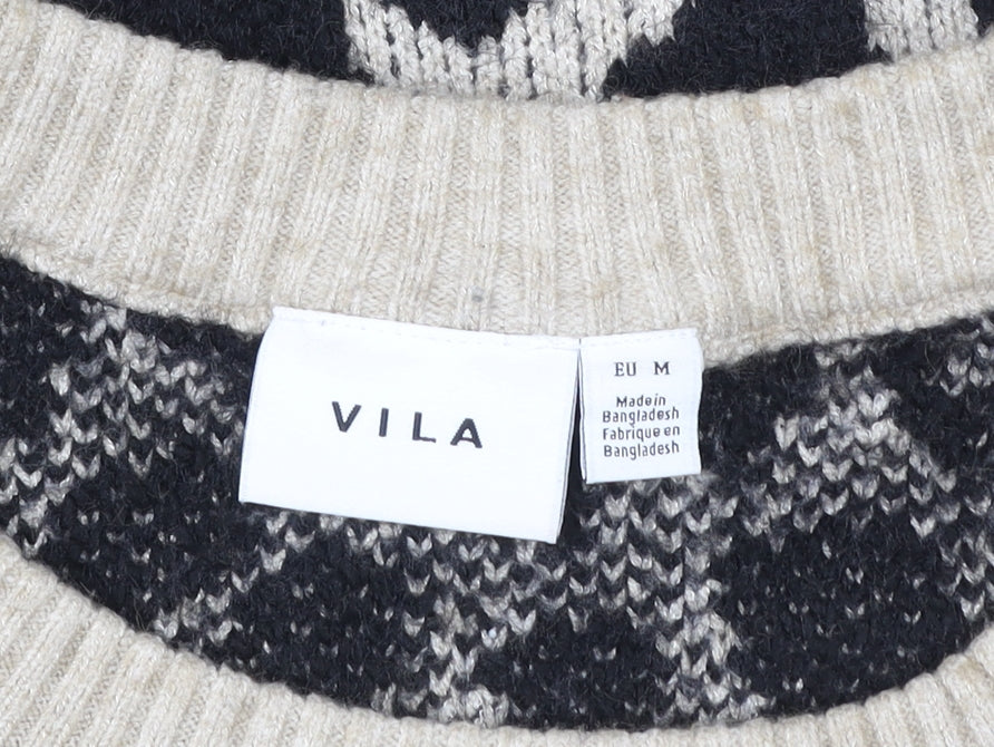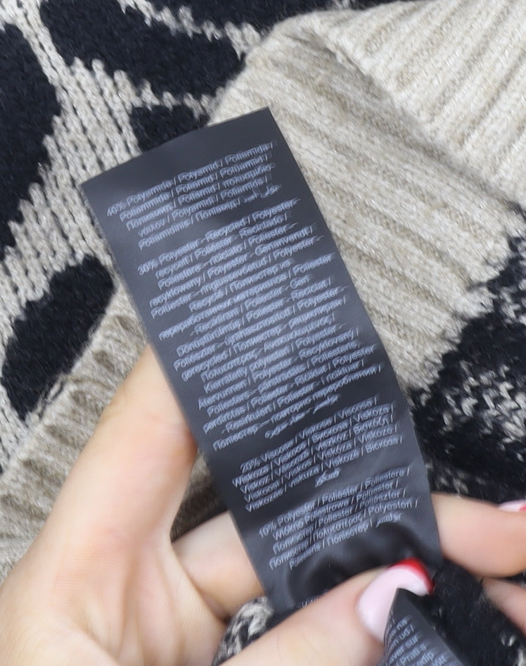 This fashionable Vila Women’s beige leopard print jumper brings a timelessly chic look to your wardrobe. Designed in a stylish pullover silhouette, this jumper features a statement animal print pattern in bold black against a soft beige knit. The crew neckline gives a classic touch, while the ribbed cuffs and hem provide a neat structure and snug fit. Crafted from a quality blend of 40% Acrylic, 30% Polyester, 25% Nylon, and 5% Wool, this jumper offers warmth and durability with a comfortable lightweight feel. Perfect for layering during the cooler months, it’s versatile enough for both relaxed weekends and smart-casual outings. The long sleeves offer cosy coverage ideal for autumn and winter wear, while the regular fit makes it flattering and easy to style with jeans, skirts, or tailored trousers. Machine washable for hassle-free care, it strikes the perfect balance between practicality and style. Whether worn for a laid-back coffee outing or a day in the office, this Vila jumper ensures comfort without sacrificing fashion appeal. In excellent pre-loved condition with only minimal signs of wear, it reflects quality craftsmanship and contemporary Danish design flair that Vila is known for. Add an effortlessly trendy and animal-inspired piece to your knitwear collection with this versatile and comfortable jumper – perfect for dressing up or keeping it casual with timeless appeal that never goes out of style.