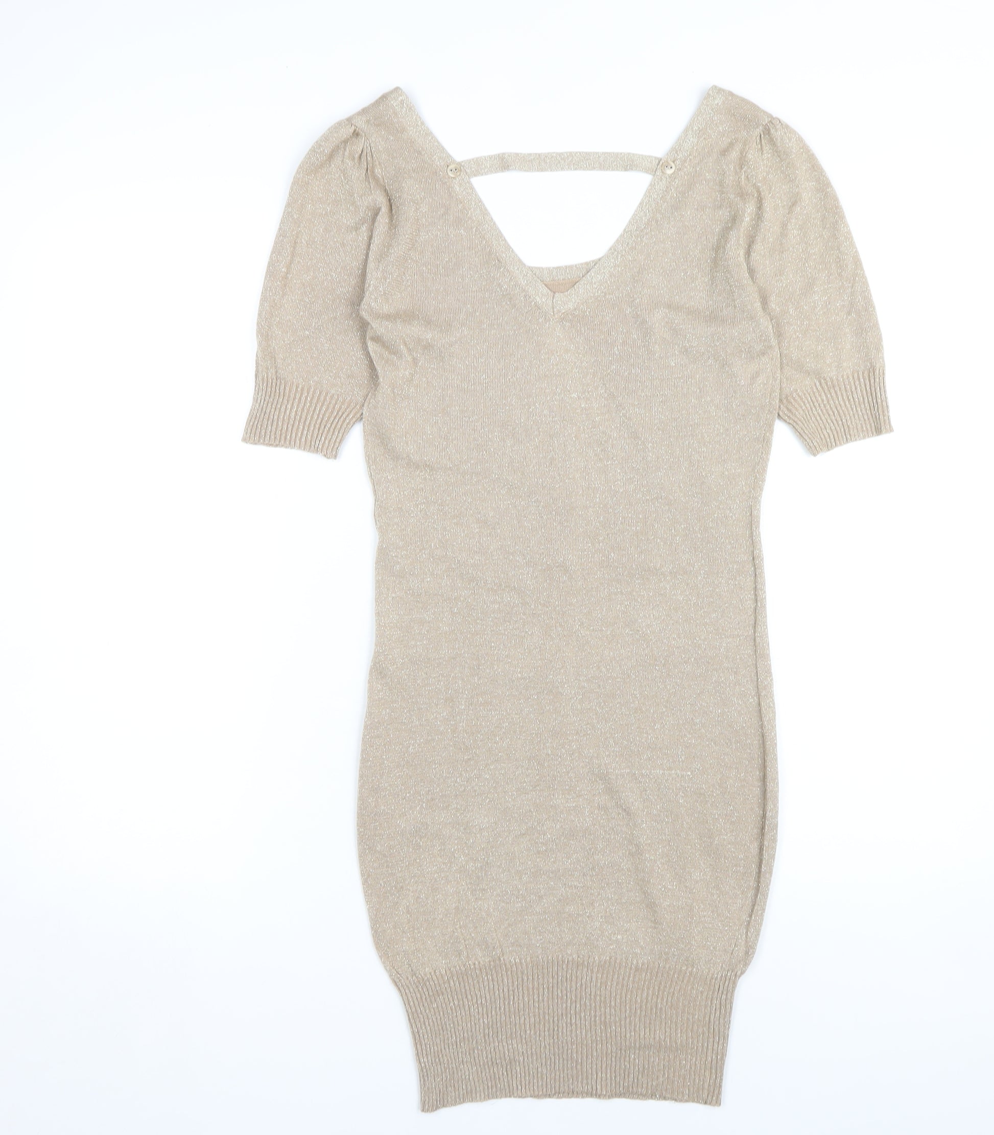 Step out in style with this chic VILA Women's Beige Knit V-Neck Dress, tailored for those who value both comfort and elegance. This dress, in a subtle beige hue, promises to complement a range of accessories and occasions. Crafted for the modern woman, it features a flattering V-neckline and effortless half sleeves, perfectly balancing style and simplicity. The knit fabric ensures a comfortable fit, allowing ease of movement throughout the day. Whether it's a casual day out or a semi-formal gathering, this dress provides versatility and class. With its excellent condition and no visible wear, it's a must-have addition to your wardrobe. Perfect for layering or wearing solo, pair it with your favourite jewellery and footwear to create a look that's undeniably you.