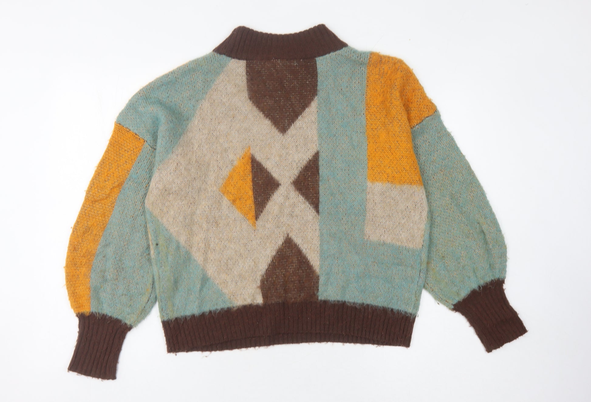 Elevate your casual wardrobe with this eye-catching Vila women’s jumper. Designed in a chic multicoloured geometric pattern, this jumper features a high neckline and long, balloon sleeves for a contemporary, relaxed fit. Crafted with a blend of acrylic, nylon, wool, and alpaca, this chunky-knit garment promises to keep you warm and comfortable while providing a stylish statement. Perfect for layering during cooler months, this versatile knitwear can be paired effortlessly with jeans or skirts. Whether you're heading out for a casual day or looking to brighten up your laid-back outfit, this jumper adds a pop of colour and pattern to your ensemble. Sold in excellent used condition with some light wear, it remains a fashionable choice for any season. Don't miss out on the chance to own this beautiful piece, ideal for anyone seeking a blend of comfort and style.