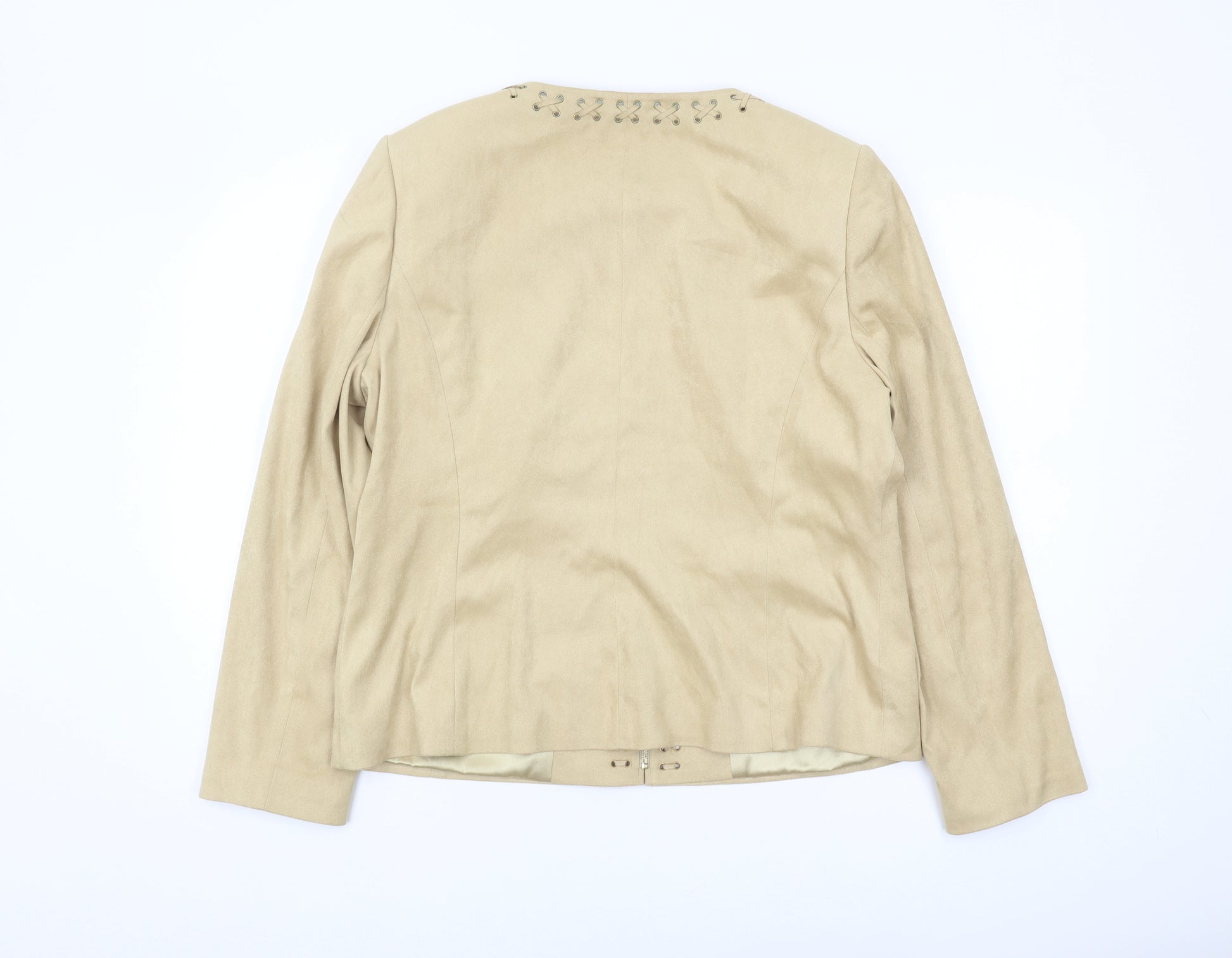 Add a touch of elegance to your wardrobe with this Viyella women's jacket. Crafted in a classy beige hue, it's perfect for versatile styling. Composed of a polyester and elastane mix, the fabric ensures comfort and a modest stretch for ease of movement. The full polyester lining enhances comfort, making it ideal for day-long wear. Despite its minimal wear, the jacket is maintained in excellent condition, reflecting the top quality you can expect from Viyella. It features long sleeves, blending sophistication with utility. Best suited for a casual occasion or a smart ensemble, it easily integrates into any wardrobe. The minimalist design accentuates its versatility, making it suitable for both day and evening events. Its machine washable attribute lightens maintenance efforts. Upgrade your collection with this timeless piece, perfectly balancing style and practicality at an enticing price.