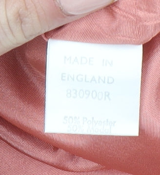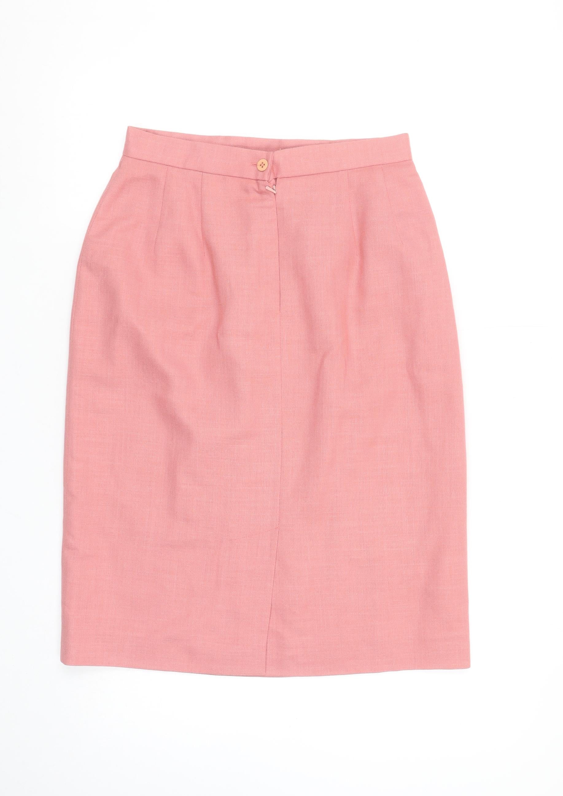 This elegant Viyella women’s pencil skirt in a soft pink hue perfectly combines timeless sophistication with versatile wearability. Designed in a flattering straight silhouette, it features a classic high-rise waist and knee-length cut that enhances a polished and feminine look. The simple, tailored design is lightly pleated at the waist to provide subtle structure, ideal for a streamlined fit that transitions seamlessly from office wear to formal social occasions. Made in England, this skirt showcases Viyella’s renowned quality and craftsmanship. The material blend of 50% polyester and 50% modal ensures both durability and comfort, offering a soft, breathable texture with a smooth finish. The twill weave fabric enhances its strength while maintaining a refined drape, ensuring the skirt keeps its shape and remains elegant throughout wear. This item is neatly finished with a discreet button and zip closure for secure fastening and a clean, tailored appearance. It also features a smooth inner lining for added comfort. In excellent condition with only minimal signs of prior wear, this vintage-style Viyella piece is an authentic symbol of British tailoring excellence. Suitable for professional, business, or formal settings, it pairs beautifully with a silk blouse, light knit top, or tailored blazer. The soft pastel pink colour provides a fresh seasonal look, making it an ideal option for spring and summer, while still versatile enough for autumn ensembles. With its understated simplicity and refined silhouette, this vintage Viyella skirt offers a feminine yet classic wardrobe staple for the modern woman. Maintain its quality by dry cleaning only, ensuring its long-lasting style and soft finish remain preserved for years of wear. A perfect choice for those seeking an elegant blend of timeless British fashion and everyday sophistication.