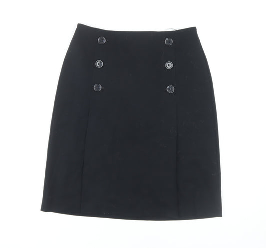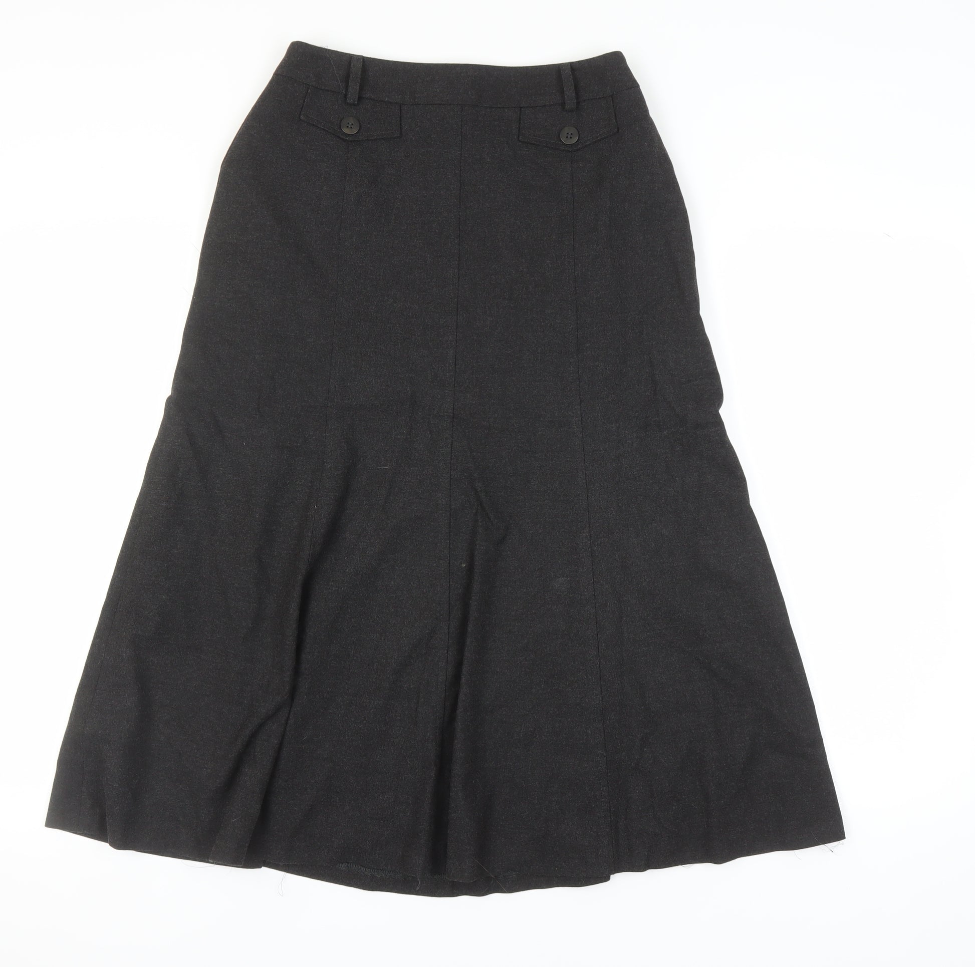 Step out in style with this sophisticated Viyella black A-Line skirt, expertly tailored for petite women. Crafted from a comfortable blend of polyester, viscose, and elastane, it offers both durability and a slight stretch for an effortless fit. With its elegant midi length and timeless black hue, this skirt is perfect for any business or casual occasion.The classic A-Line cut is designed to flatter, giving you a sleek silhouette. Adorned with subtle button accents, it adds a touch of sophistication while remaining practical and accessible with a discreet zip closure. Designed for all seasons, it will become a staple in your wardrobe, suitable for autumn, winter, and spring.This skirt features no pattern, allowing you to pair it easily with various tops and accessories. Its versatile nature makes it ideal for both business settings and casual outings, ensuring you always look polished.Don't miss out on this excellent condition skirt, which offers high-quality craftsmanship and style at a great price. Make this versatile and stylish skirt from Viyella your go-to piece for an effortlessly chic look.