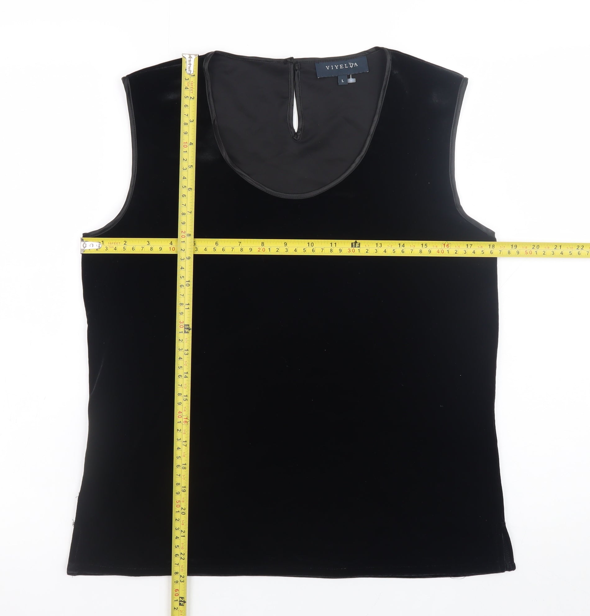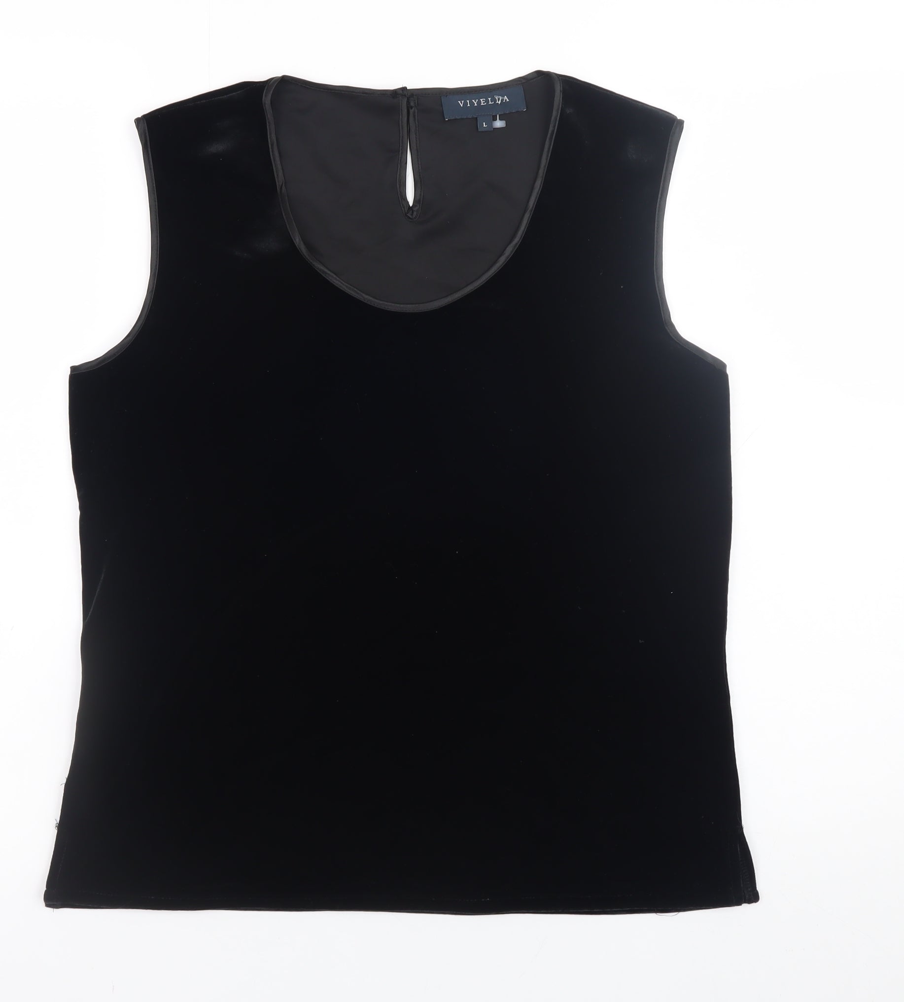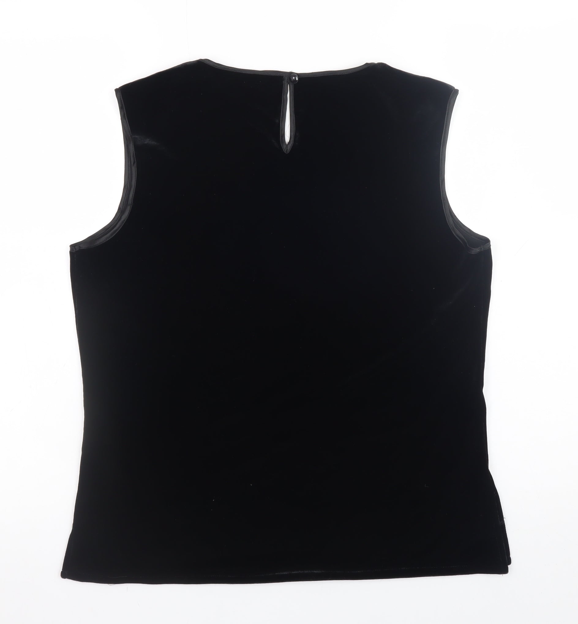 Elevate your wardrobe with this elegant Viyella women’s black sleeveless top, crafted to combine timeless sophistication with comfort. This versatile tank top, crafted from a high-quality blend of 90% polyester and 10% elastane, offers a subtle stretch fit that flatters the silhouette while ensuring ease of movement. The soft, velvet-like fabric adds a luxurious touch and enhances the richness of the deep black shade, making it perfect for both day and evening wear. Designed with a classic scoop neckline and featuring a small back button closure for easy dressing, this top encapsulates understated refinement. The sleeveless cut allows it to be effortlessly layered under blazers, cardigans, or paired with elegant skirts or trousers for a polished look. Whether you’re heading to a formal dinner, a special event, or simply looking to elevate your casual attire, this Viyella top offers a piece that transitions seamlessly between occasions. The plush texture and fitted cut ensure it remains both comfortable and stylish throughout the seasons, particularly ideal for autumn and winter months when paired with tailored outerwear. Conditioned in excellent used condition, this piece displays minimal signs of wear, retaining its soft texture and shape beautifully. A wardrobe essential for those who value quality material and timeless design, this Viyella sleeveless top is a versatile staple that exudes quiet sophistication and effortless charm. Rely on its build quality and premium finish to enhance your outfit on any occasion while maintaining an enduring sense of classic British style. Perfect for smart casual days, evening gatherings, or professional settings, this top brings an elevated simplicity to any outfit choice.