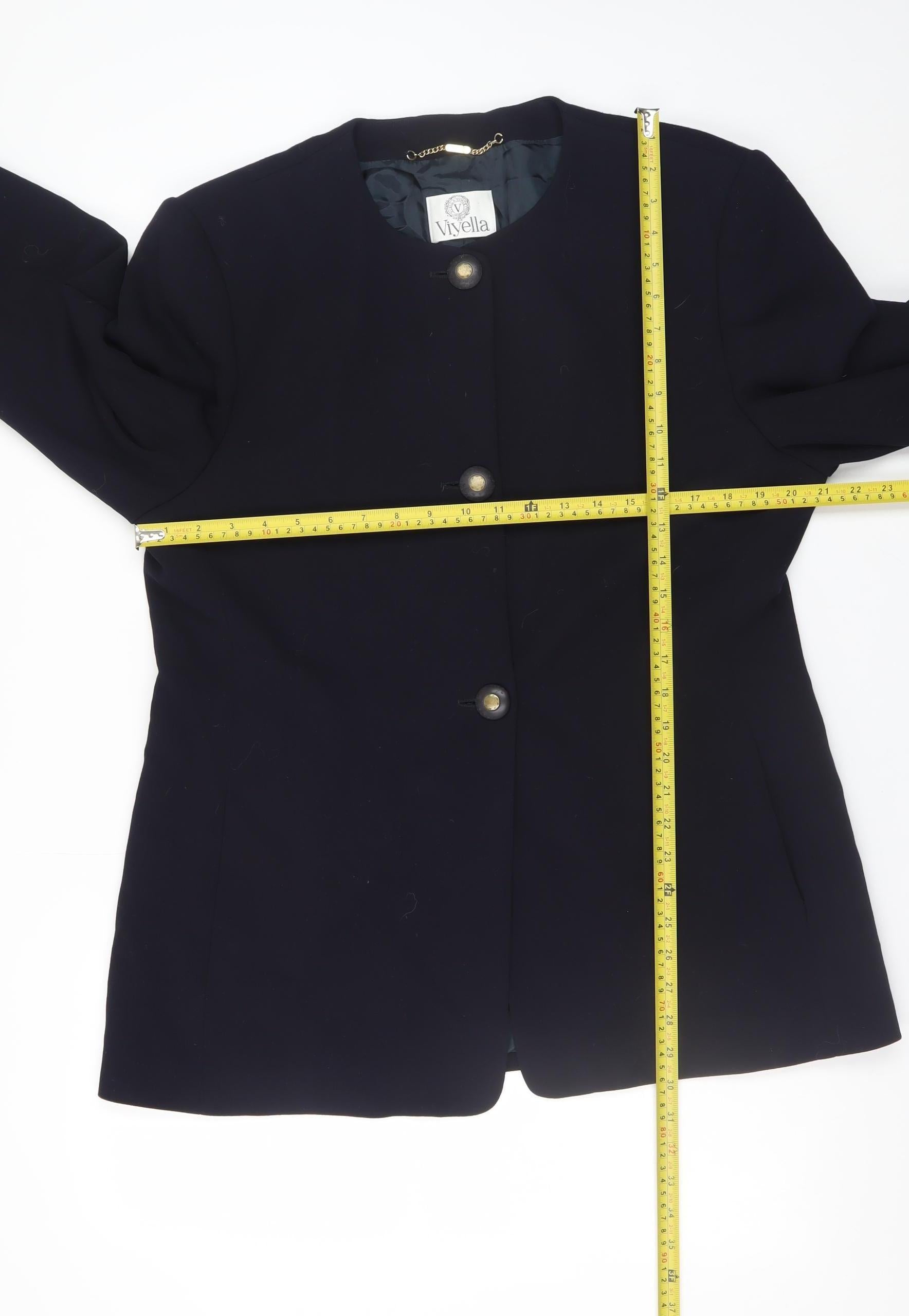 This elegant Viyella women's jacket in classic black is a timeless addition to any wardrobe. Crafted from a premium blend of 53% polyester, 45% wool and 2% elastane, it offers both comfort and structure, perfect for smart occasions or professional wear. The mid-length cut creates a flattering silhouette, while the minimalist collarless design adds a sophisticated modern twist to a classic tailored shape. Featuring full-length sleeves and a smooth button closure, this jacket is finished with careful attention to detail, embodying the refined craftsmanship Viyella is known for. Its lining enhances comfort, making it an excellent choice for transitional seasons like autumn and winter. Ideal for business meetings, formal gatherings, or elegant daywear, this piece combines understated style with enduring quality. The versatile design allows it to pair beautifully with dresses, skirts or tailored trousers, making it a go-to wardrobe staple. Despite minimal signs of gentle wear, the jacket remains in excellent pre-owned condition, reflecting light use and careful maintenance. Perfect for creating a polished and professional look while staying comfortable throughout the day, this Viyella jacket will add a touch of effortless sophistication to any outfit. A beautifully constructed garment for the modern woman who values quality and timeless style.