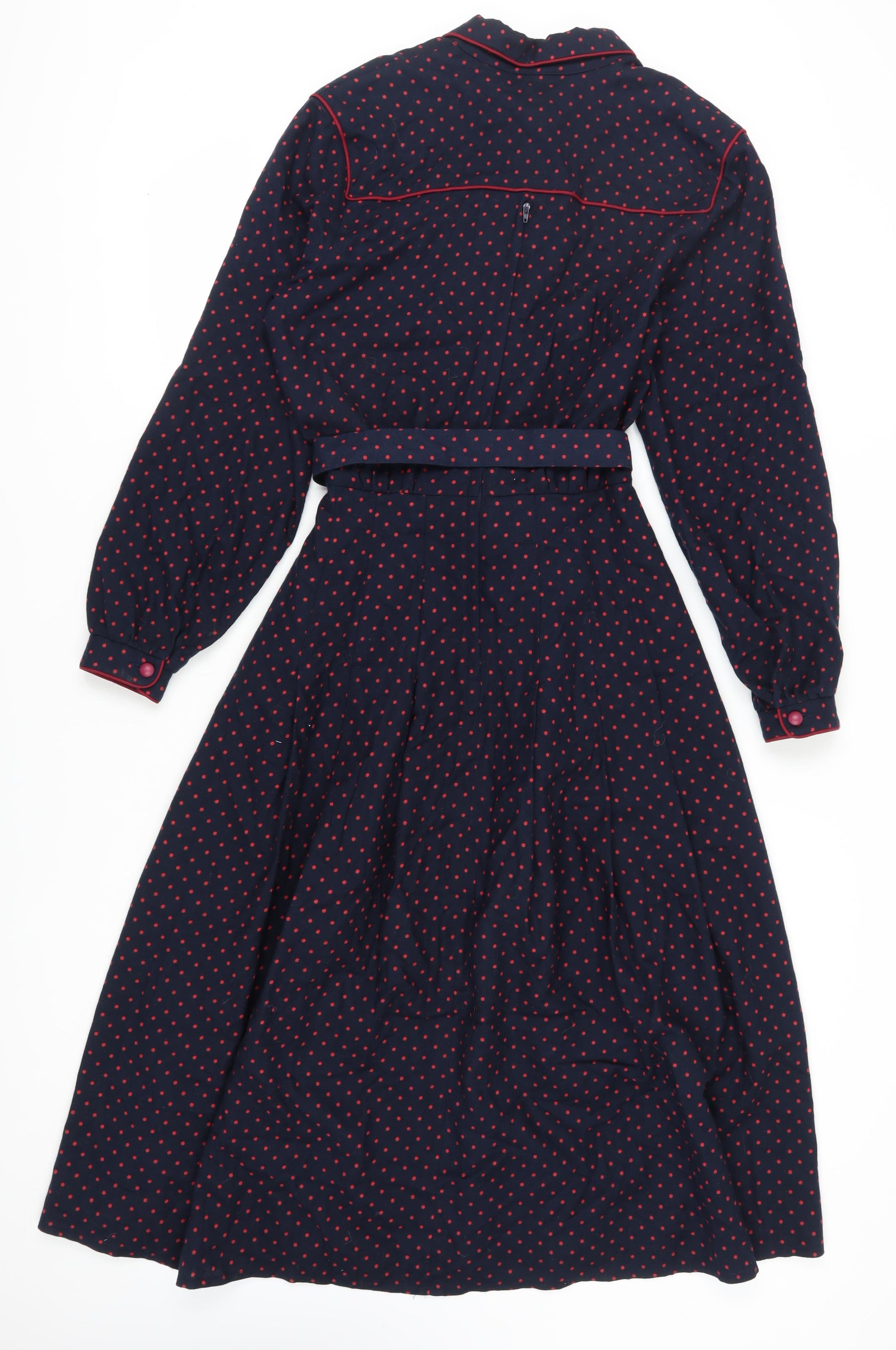 Introducing a beautiful Viyella women's shirt dress that perfectly blends classic charm with contemporary style. This elegant midi dress in a size 14 is crafted from 100% wool, offering warmth and comfort during the brisk autumn and cold winter months. The vibrant polka dot pattern enhances the multicoloured design, making it a standout piece for casual occasions. Designed with a collared neckline and long puff sleeves, this vintage-inspired dress captures the retro appeal effortlessly. The dress is belted to accentuate the waist, providing a flattering silhouette that complements various body types. The convenient button closure ensures easy wear, while the woven fabric type adds to the dress's durable quality. Although it shows slight wear, no original sales tags are visible, classifying the condition as excellent. Pair this dress with your favourite boots or heels for a complete look that is both timeless and stylish. Ideal for those looking to add a touch of retro elegance to their wardrobe.
