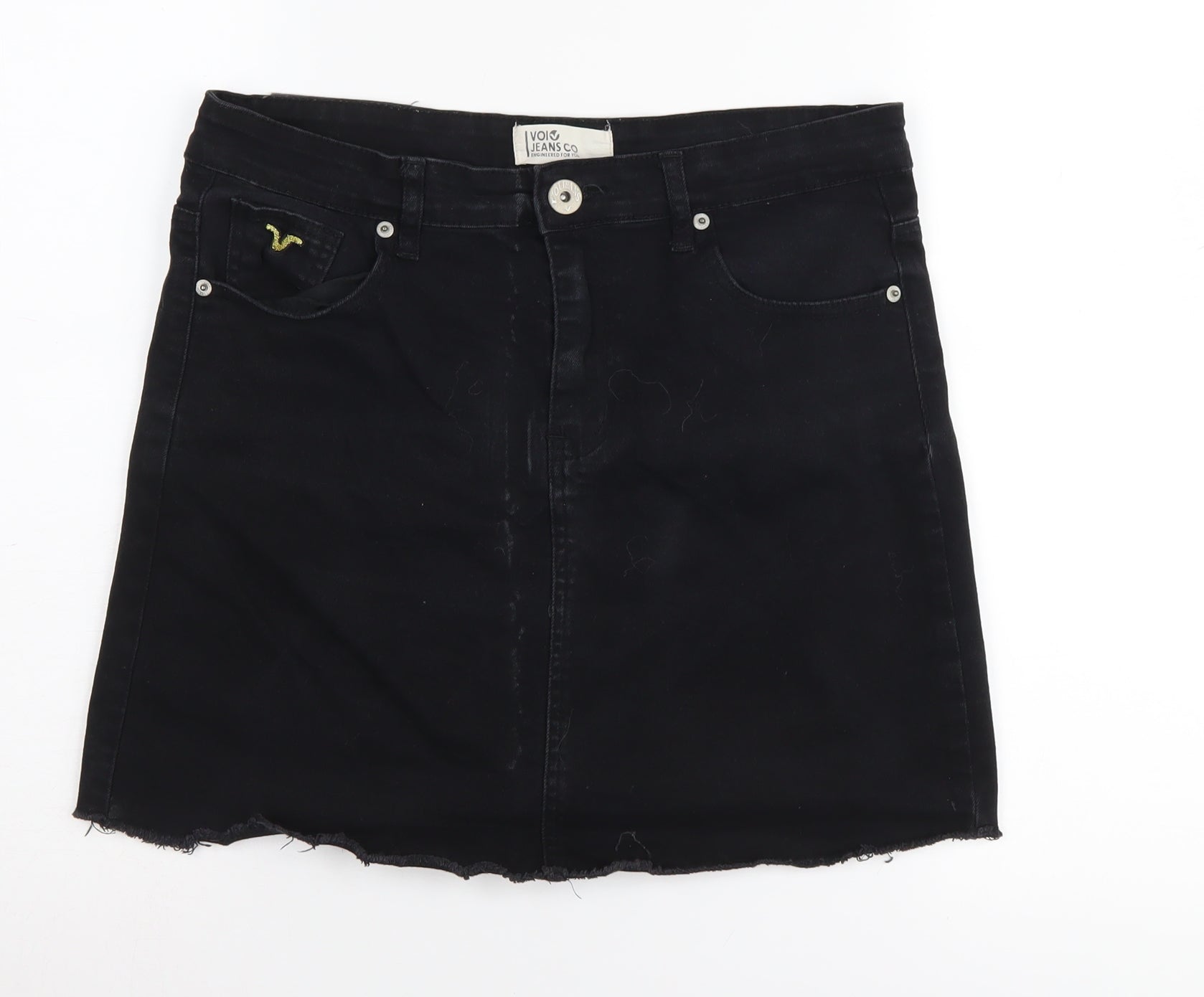 Elevate your wardrobe with this stylish VOI Jeans Co denim mini skirt. Perfect for casual outings, this skirt is designed to offer both comfort and a chic look that never goes out of style. Crafted from a rich blend of 98% cotton and 2% elastane, the fabric ensures a snug fit while still allowing easy movement. The classic black colour gives it versatility, making it easy to pair with a range of tops and accessories. Featuring a mid-rise for a comfortable fit, this skirt combines timeless denim appeal with a contemporary cut. The raw hem and button accents add a trendy touch, further highlighted by the practical addition of pockets for your essentials. With a secure zip and button closure, this piece ensures you stay comfortable and confident throughout the day. Despite having a slightly worn fabric look, the skirt remains in excellent condition, offering great value and style. Ideal for all seasons, this skirt can effortlessly transition from day to night with the right ensemble. Whether you're heading out for a brunch or a relaxed evening with friends, this VOI Jeans mini skirt is a go-to choice for effortless fashion. Machine washable, it promises easy care, allowing you to keep it looking fresh and new with minimal effort. Make it a new staple in your wardrobe and enjoy the blend of casual style and practicality this skirt brings.