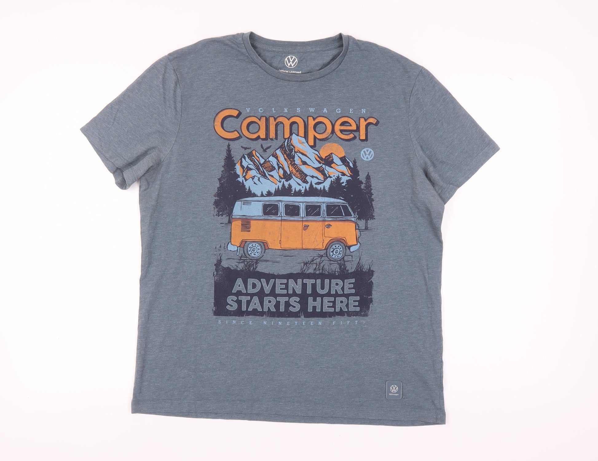 Explore the outdoors in style with this Volkswagen Men's Adventure T-Shirt. Crafted from a comfortable blend of 52% polyester and 48% cotton, this grey tee offers a soft jersey feel that's perfect for all seasons. Embrace your adventurous spirit with its bold graphic print featuring a classic camper and mountain scenery, designed for those with a love for travel and exploration. The short sleeves and crew neck provide an effortlessly relaxed fit, ideal for casual outings or laid-back weekends. This officially licensed Volkswagen product guarantees authenticity and quality, making it a must-have for fans of the iconic brand. Whether you're hitting the road or embarking on a new journey, this t-shirt is a stylish companion that captures the essence of adventure.