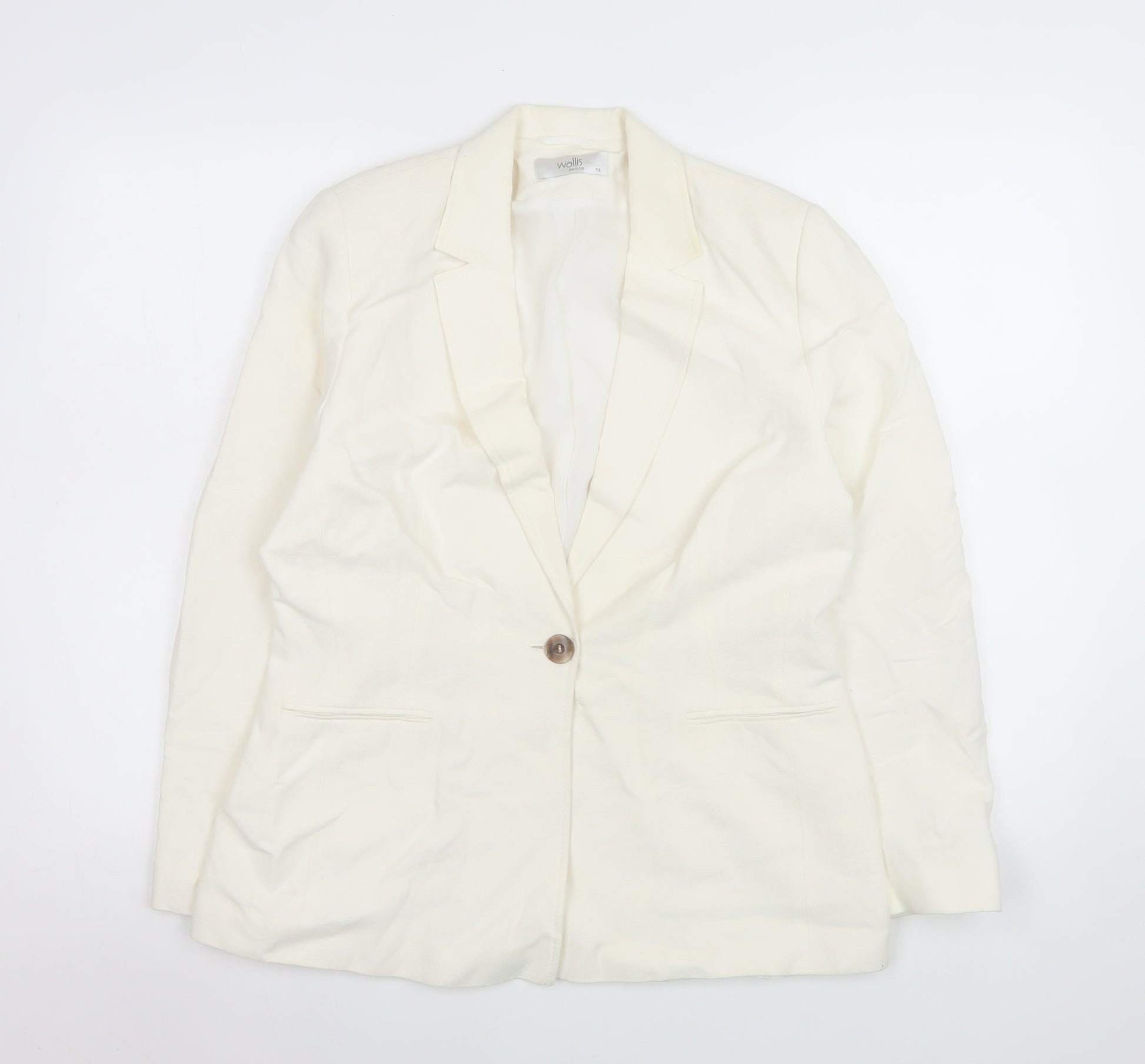 This elegant Wallis women's ivory blazer combines timeless sophistication with versatile modern style. Crafted from a soft linen-viscose blend, the jacket offers a light and breathable texture ideal for warmer seasons. The woven fabric gives it a structured yet comfortable fit, perfect for any professional or special occasion. Designed in a flattering regular fit, this fully lined blazer features a classic notch lapel and a single front button fastening that highlights the waistline while maintaining a sleek, tailored silhouette. The smooth ivory tone adds a refined elegance that will effortlessly pair with a wide range of outfits, from smart trousers to pencil skirts or jeans for a polished weekend look. Sized UK 14 (Euro 42), it provides a comfortable fit for women seeking chic, sophisticated workwear or a refined finishing layer for events. Ideal for spring and summer wear, its lightweight feel and breathable fabric ensure comfort throughout the day. The blazer includes practical details such as inner lining for added durability and comfort and front welt-style pockets for subtle styling. Although in very good pre-owned condition, there is a faint pink mark on the front that does not detract from its overall presentation. This high-quality Wallis piece captures effortless charm and versatility – an essential addition to any modern wardrobe for business meetings, formal occasions, or refined casual outings. Elevate your look with this stylish and comfortable ivory blazer that embodies polished femininity and understated sophistication.