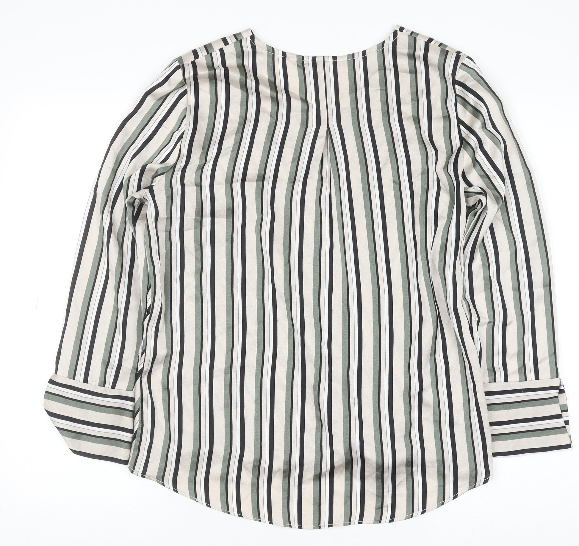 Add a touch of elegance to your everyday wardrobe with this striking Wallis Petite striped wrap blouse in a flattering UK size 12. Designed for the modern woman, this lightweight woven blouse features a sophisticated wrap-over front that drapes gracefully, giving a polished silhouette perfect for both professional and casual outings. The combination of vertical stripes in soft tones of beige, black, white, and green elongates the figure, while the long fitted sleeves and dropped back hem ensure a comfortable and flattering fit for petite proportions. Made from 100% polyester, the blouse feels smooth and airy, ideal for all-day wear across multiple seasons—whether layered under a jacket in autumn or worn solo in the warmer months. The V-neckline adds a touch of femininity, making it easy to accessorise with a delicate necklace for office wear or a statement pendant for a chic evening look. As a pullover style with no closures, it’s both simple and stylish, embodying the effortless Wallis aesthetic.This versatile piece works beautifully with tailored trousers for workwear chic or slim jeans for a relaxed weekend ensemble. Lightweight and easy to care for with machine washability, it is a practical choice that still offers sophisticated appeal. With its comfortable regular fit and timeless striped design, this blouse provides lasting style and comfort for the confident woman who values understated elegance.In excellent pre-loved condition with no visible flaws, this blouse represents great value and quality from the trusted Wallis brand. Perfect for spring, summer, and autumn days, it’s a must-have addition to any capsule wardrobe, blending refined style with everyday versatility.