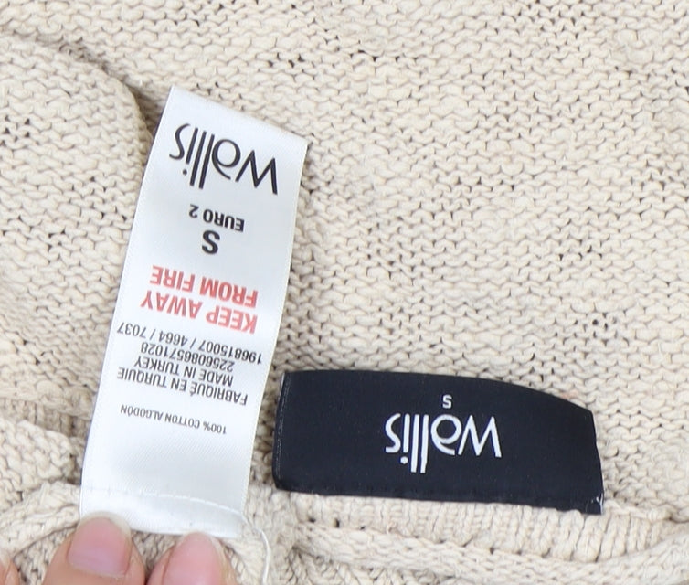 This stylish Wallis beige jumper effortlessly combines comfort with a relaxed fit for an elegant casual look. Crafted from 100% cotton, it promises soft, breathable comfort for all-day wear. The intricate cable-knit design adds a touch of classic charm to your wardrobe, while the raglan 3/4 sleeves and round neckline enhance its contemporary appeal. Ideal for casual outings, this jumper can be paired with your favourite jeans or a skirt for a chic ensemble. The beige colour offers versatility, making it easy to coordinate with other wardrobe essentials. The jumper's excellent condition assures durability, with only slight wear visible upon close inspection. Whether for a laid-back meeting or a cosy coffee shop visit, this Wallis jumper is your go-to choice for any casual occasion. Don't miss the opportunity to add this timeless piece to your collection at an affordable price.