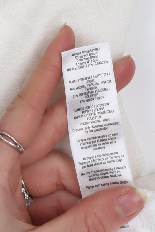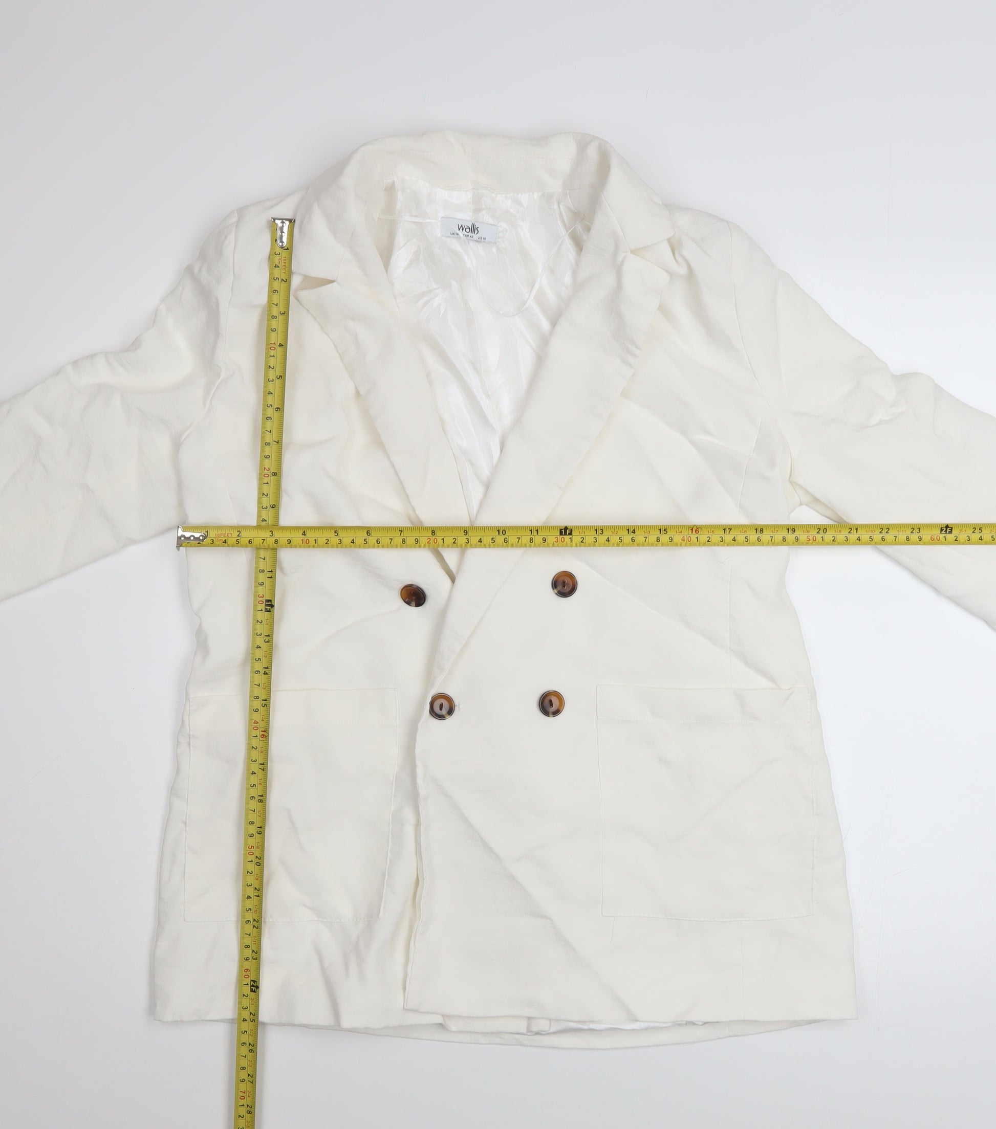 This elegant ivory blazer from Wallis is a timeless piece perfect for both business and casual occasions. Crafted from a blended fabric of 46% viscose, 37% polyester and 17% nylon, it combines softness, durability and a smooth drape. Designed in a flattering mid-length cut, this women’s double-breasted jacket features tortoiseshell-style buttons, a structured lapel collar and front patch pockets that combine style with practicality. Fully lined in 100% polyester, it offers a comfortable fit and high-quality finish. The blazer’s minimalist style and versatile ivory shade make it a superb option for layering over dresses, blouses or tailored trousers. Ideal for spring and autumn wear, it’s a piece that transitions effortlessly from workwear to smart-casual outfits. The tailored silhouette enhances confidence and sophistication while the light fabrication provides breathability. In very good used condition, this blazer shows light creasing from storage but no noticeable damage or wear, maintaining its appeal and longevity. Perfect for the modern woman looking for a chic addition to her wardrobe, this Wallis blazer delivers a refined, confident look without compromising comfort. Pair it with slim trousers and heels for professional meetings, or dress it down with jeans and loafers for a relaxed weekend ensemble. Whether you're refreshing your wardrobe staples or seeking a timeless smart jacket, this Wallis piece is a reliable and stylish choice offering understated elegance and enduring versatility.