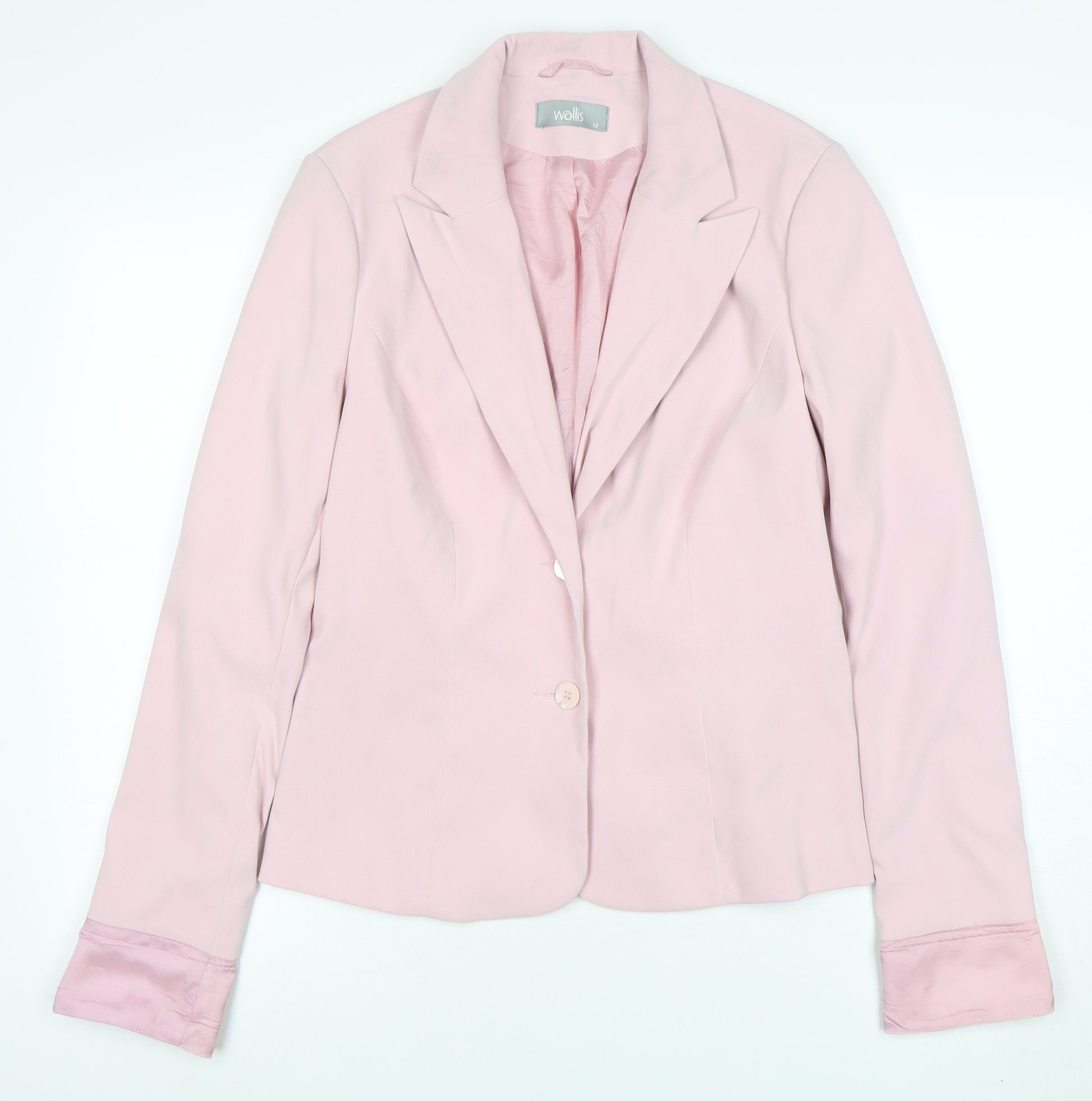 Add understated elegance to your wardrobe with this beautiful blush pink blazer from Wallis. Crafted for the modern woman, this tailored single-breasted jacket is designed in a refined pastel tone that pairs effortlessly with both professional and casual outfits. Made from a soft woven blend of 97% polyester and 3% elastane, it offers a hint of stretch for comfortable all-day wear while maintaining a structured and polished look. The jacket features a classic notch lapel design, two-button front closure, and long sleeves, making it a timeless addition to any wardrobe. Lined with smooth 100% acetate, it ensures a luxurious finish and an easy fit over blouses or dresses. Perfect for business meetings, formal occasions, or smart-casual styling, this Wallis blazer is versatile enough to transition seamlessly from office to evening. The tailored cut flatters the waist, enhancing a clean and confident silhouette. In excellent pre-loved condition, it shows minimal signs of wear and remains ready to impress its next owner. Ideal for the woman who values sophistication and comfort, this blazer can be styled with matching trousers or a skirt for a coordinated look, or worn with jeans for a softer tailored edge. A stylish, functional, and feminine piece suitable for spring through autumn wear, this jacket is a wardrobe essential that will never go out of fashion. Invest in timeless tailoring and make this elegant Wallis blazer your go-to piece this season.