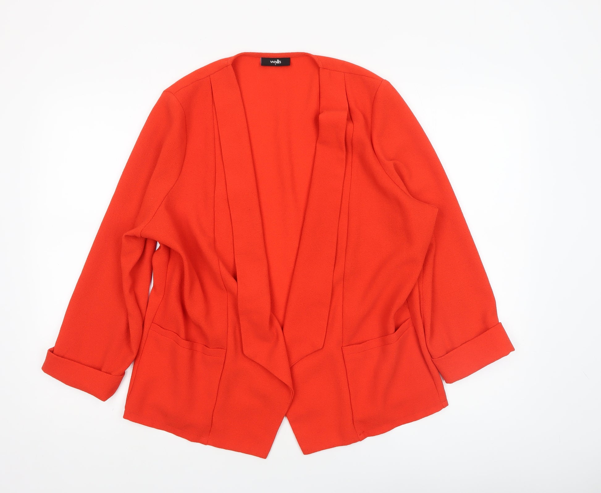 Elevate your wardrobe with this bold red open-front blazer jacket from Wallis, designed to offer a smart yet contemporary silhouette for any occasion. Crafted from a high-quality woven blend of 97% polyester and 3% elastane, this piece provides both durability and gentle stretch for enhanced comfort and movement. The shawl lapel design and clean, unstructured cut create a refined aesthetic that's ideal for professional, casual, or transitional styling throughout the seasons. The regular fit ensures a flattering drape, while the lightweight construction makes it the perfect layering piece for spring, summer, and autumn wear.This Wallis blazer in size Large (UK L / EUR 44–46) offers a timeless fit suitable for a range of body shapes. Featuring long sleeves and practical front pockets, it combines classic tailoring with relaxed elegance, ideal for seamlessly pairing with trousers, skirts, or jeans. The open-front design enhances its versatility, making it suitable for both business meetings and everyday chic outfits.The vivid red hue adds an eye-catching pop of colour that transforms any ensemble into a statement look. Whether styled over a crisp blouse for workwear sophistication or layered casually for weekends, this blazer remains an essential in any wardrobe. Its regular fit and soft woven fabric make it perfect for mild to moderately warm weather, providing effortless polish without compromising comfort.Conditioned in excellent pre-owned shape, showing gentle previous use but no visible marks or damage, it’s ready for continued wear and enjoyment. Machine washable for easy care, this blazer delivers both functionality and fashion value. Invest in a versatile wardrobe staple that blends Wallis’ signature quality with everyday practicality—perfect for modern women who appreciate timeless elegance and comfort-driven style.