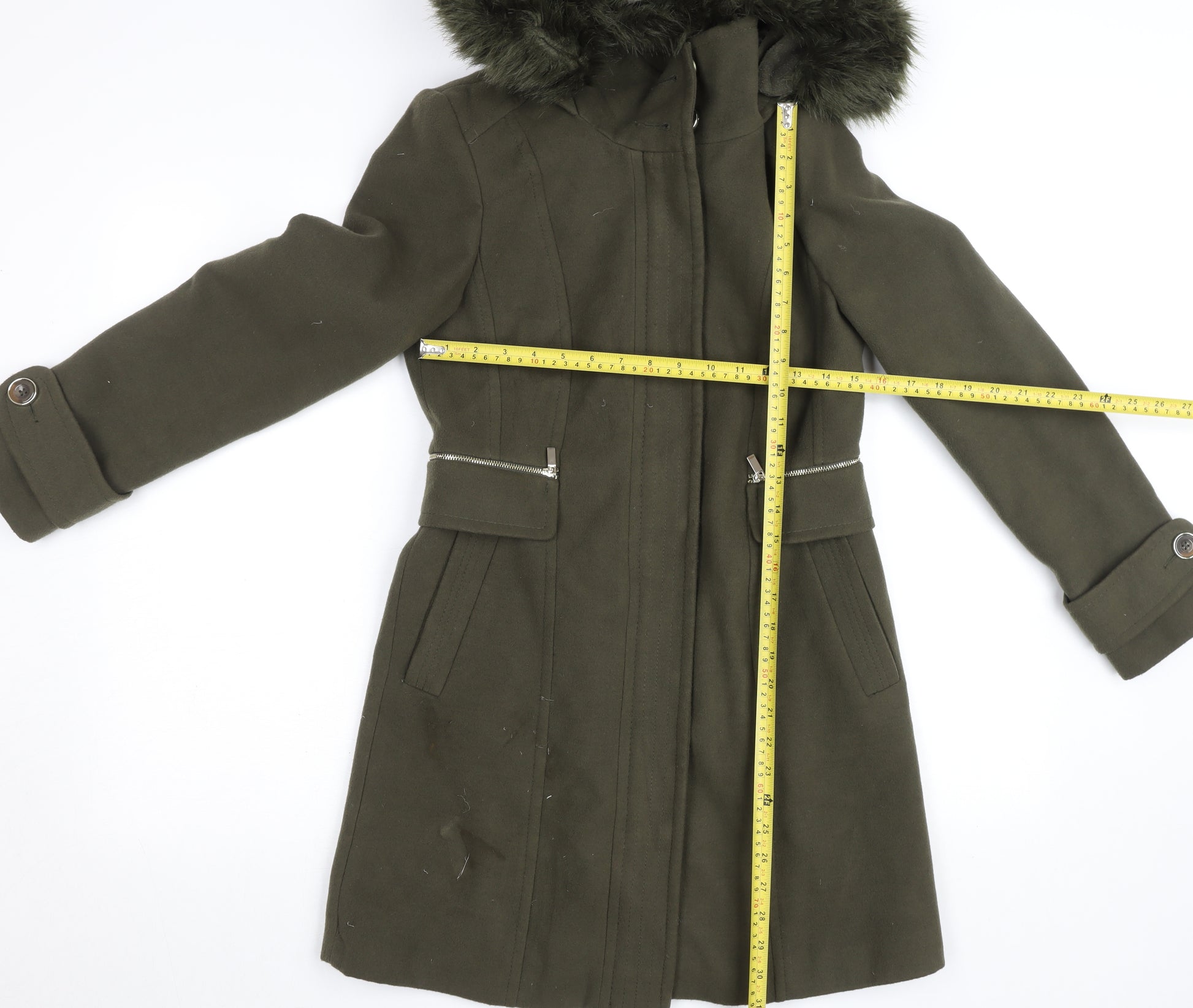 Stay effortlessly stylish and cosy this season with this Wallis Women’s Green Faux Fur Hooded Long Parka Coat in size 8. Crafted with a soft twill outer shell made primarily from polyester with added viscose, this coat offers durability, warmth, and an elegant finish that's perfect for everyday wear. The deep green hue gives this piece a timeless and chic appearance, ideal for pairing with both casual jeans and smarter outfits for versatile wear across multiple seasons. Designed in a long parka style, the coat provides excellent coverage against the cold while maintaining a flattering feminine silhouette. The luxurious faux fur trim around the hood adds a touch of sophistication and warmth, ideal for the autumn and winter months. Functional details include a full zip and button front closure for secure fastening, two spacious front pockets with zip accents for practicality, and buttoned cuffs for a refined finish. The coat is fully lined for added comfort and insulation, ensuring that you stay warm and protected in colder temperatures. Perfect for day-to-day outings, travelling, or simply elevating your casual wardrobe with a classic piece, this Wallis coat combines practicality with understated luxury. The high-quality materials and attention to detail make it a reliable outerwear choice for seasons to come. In very good used condition, this coat shows minor signs of wear with a few light marks on the front panel, but remains in excellent structural shape, ready to offer years of fashionable warmth. Ideal for the modern woman who values comfort, sophistication, and versatility in her outerwear, this Wallis coat makes a great addition to your collection.