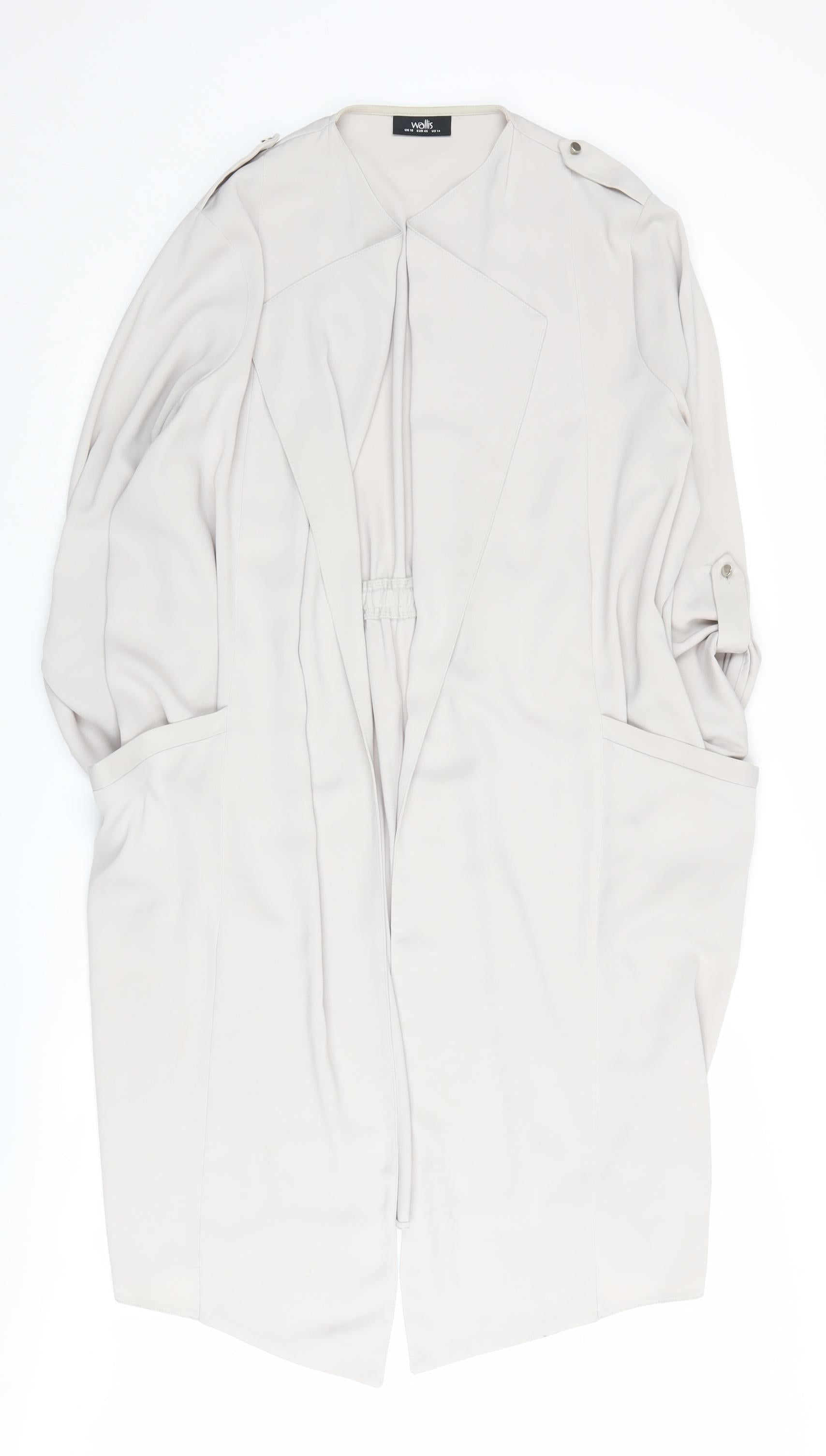 Featuring a versatile beige tone, this Wallis women's jacket is your go-to choice for a blend of elegance and casual style. Crafted from a durable and comfortable mix of polyester and elastane, it ensures a perfect fit and lasting comfort. Ideal for those crisp spring and autumn days, its long length and open front design add a chic, relaxed look to your outfits. With a discreet elastic waist, this jacket offers a flattering silhouette that's especially enticing for those looking to add a touch of sophistication to their everyday wardrobe. Designed for machine washability, maintaining its pristine look is effortless. Although it shows slight signs of wear, it retains its excellent condition, making it a smart buy for the savvy shopper. Experience the timeless style and superior comfort that Wallis brings with this regular-fit jacket, tailored for the modern woman on the go.