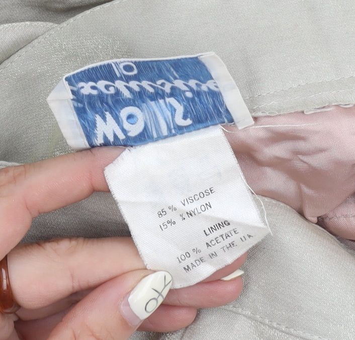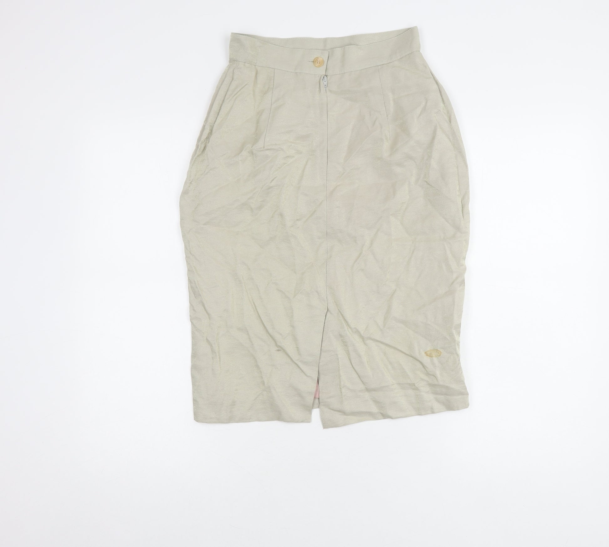 Explore classic elegance with this Wallis beige pencil skirt, designed for the sophisticated woman who values both style and comfort. This women's skirt is crafted from a luxurious blend of viscose and nylon, making it not only stylish but also lightweight and comfortable for everyday wear. With its straight and pencil silhouette, it offers a timeless look, perfect for casual outings or even a relaxed business environment. The skirt is adorned with a chic button accent, adding a subtle touch of style. Featuring a convenient zip and button closure, it ensures a secure fit that you'll appreciate. The slit feature provides ease of movement, enhancing both comfort and elegance. Though this vintage piece does come with a slight stain on the front, it offers a unique charm that captures a classic look. Pair it with a simple top and you’re ready for any casual occasion. Embrace the past and make a statement in your wardrobe with this exquisite Wallis skirt.
