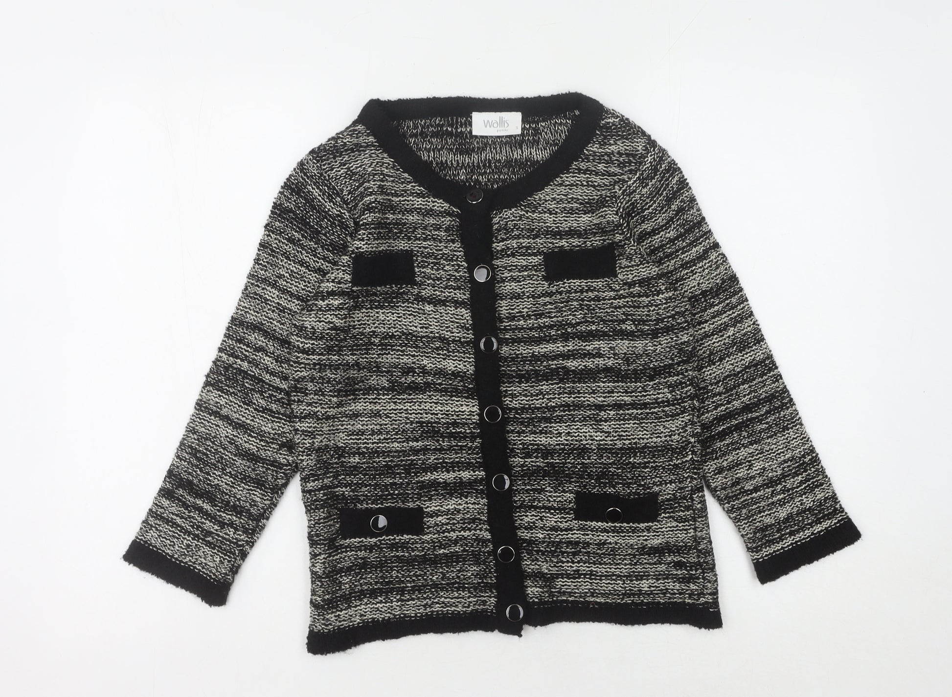 This Wallis petite black cardigan is a versatile addition to any wardrobe. Crafted from a blend of acrylic, cotton, and polyester, it features a chunky-knit style that provides a cosy yet stylish look. The cardigan has a round neckline and long sleeves with raglan sleeve design, making it suitable for casual occasions. This garment is machine washable, ensuring easy maintenance. It is accented with buttons for a classic touch. Perfect for all seasons, this cardigan seamlessly transitions from autumn to summer, offering comfort and style. Wallis delivers a high-quality piece, ideal for those who appreciate both fashion and function. This cardigan is in excellent condition, with no visible wear, promising durability for many outfits to come. Upgrade your collection with this elegant piece that pairs well with various clothing styles.