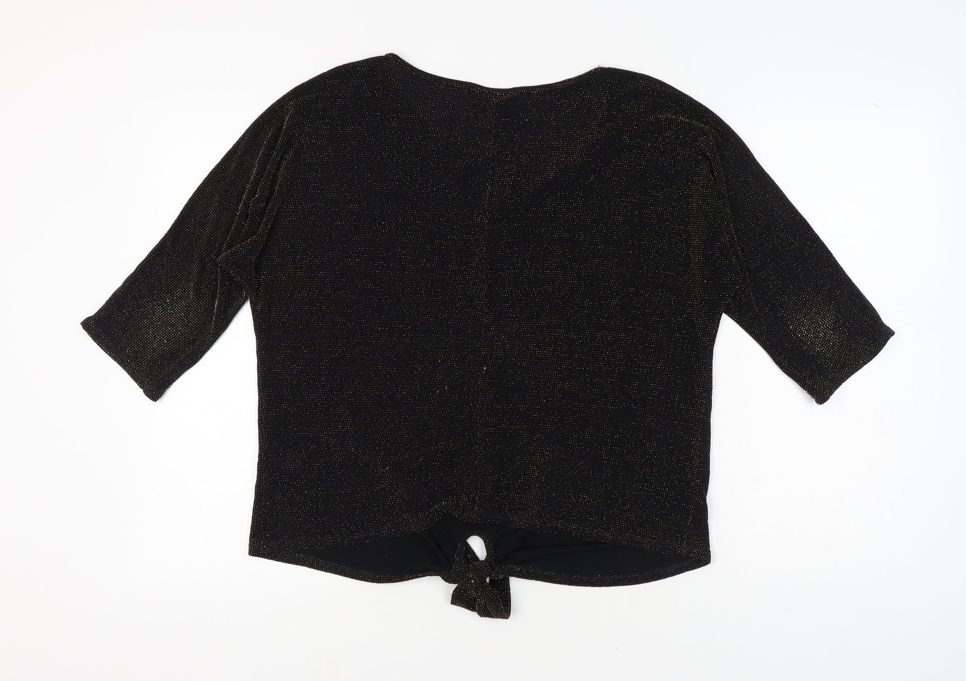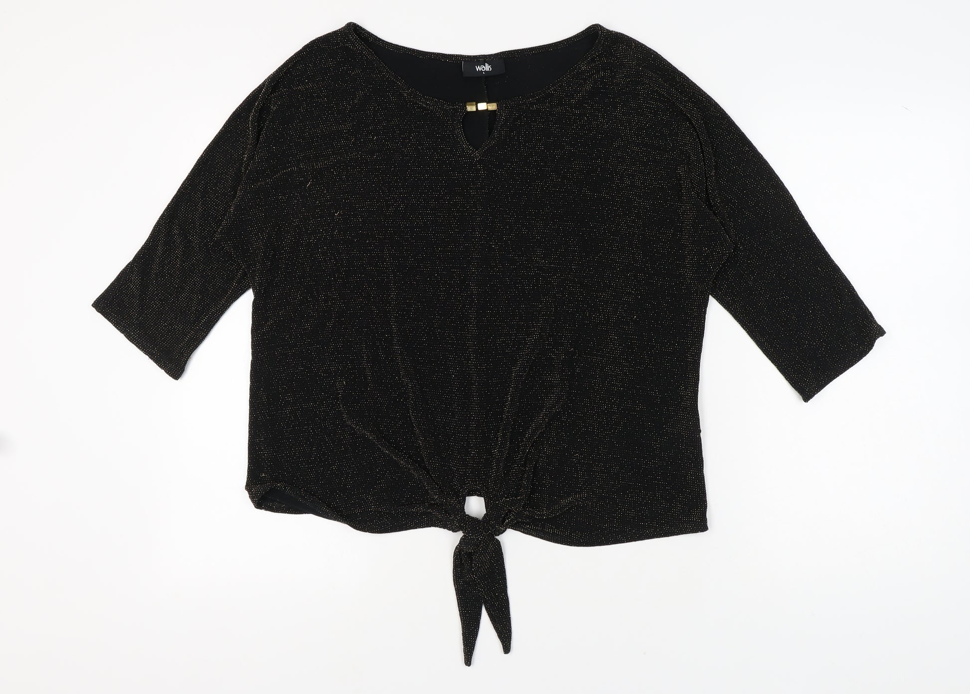 Elevate your evening look with this stunning Wallis women's blouse, designed to add a touch of sparkle to any wardrobe. The classic black hue is set off by a stylish glitter accent, giving it a sophisticated yet eye-catching finish, perfect for party and cocktail occasions. Crafted from a blend of polyester and elastane, the blouse offers a comfortable regular fit, ensuring ease of movement. The material's lightweight nature combined with 3/4 fitted sleeves offers versatility, making it an ideal choice for the cooler autumn and winter seasons.The blouse features a crew neckline and a simple pullover closure, making it easy to wear while maintaining a chic and elegant silhouette. Whether paired with tailored trousers or a sleek skirt, this piece is sure to make a statement. Despite being pre-loved, the item has been maintained in excellent condition, presenting light wear with no visible tags.This Wallis top is perfect for those looking to add a bit of sparkle to their wardrobe, suitable for all kinds of celebrations and evening events. Make a lasting impression with this glittering addition to your collection, combining the allure of style with the comfort of machine-washable care.