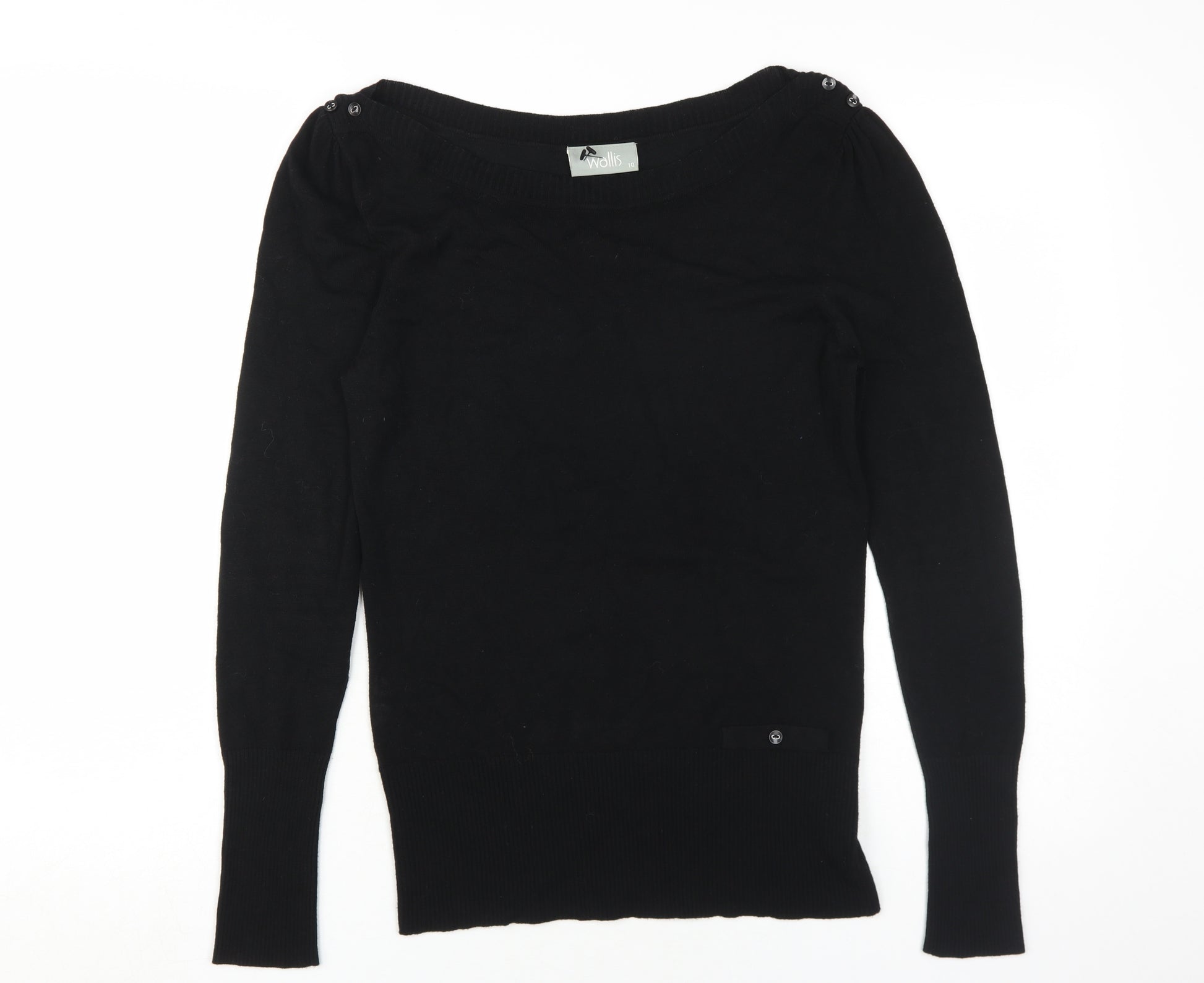 This elegant Wallis black pullover jumper is a versatile addition to your wardrobe. Crafted for women, it features a flattering boat neck design and long sleeves, perfect for keeping warm during the autumn and winter months. The jumper is made from a comfortable blend of viscose, nylon, and elastane, offering a soft knit feel that's both breathable and machine washable. Ideal for casual outings or workwear, it can be effortlessly dressed up or down. Despite minor wear typical of a pre-loved garment, it remains in excellent condition with no significant flaws. The subtle button accents add a touch of sophistication to its classic design, making it a timeless piece suitable for various occasions.