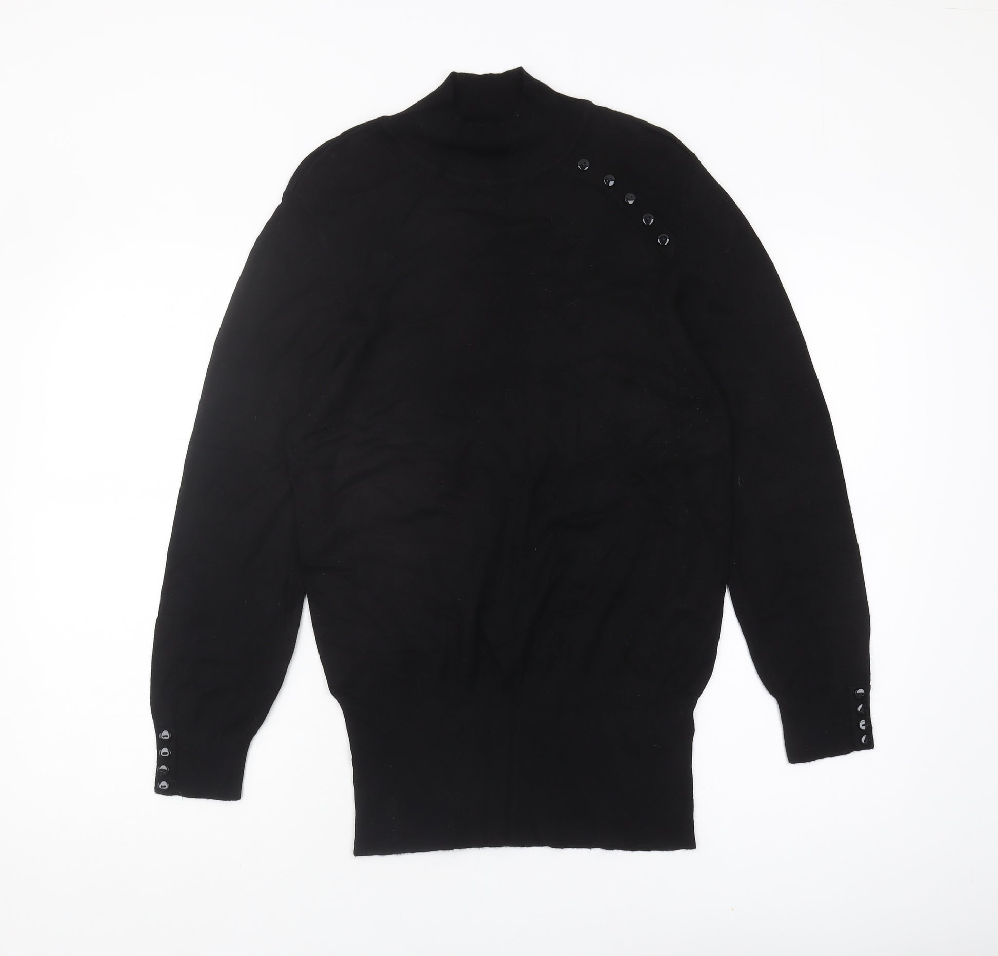 Step into chic style with this sleek Wallis pullover jumper, perfect for autumn and winter wear. Crafted for the modern woman, this black jumper features a sophisticated mock neck and a tight-knit, long sleeve design for a flattering fit. The subtle button accents add a touch of elegance, making it a versatile addition to any wardrobe. Made from a luxurious blend of viscose, nylon, and elastane, it ensures a soft and comfortable fit that is machine washable for easy care. Ideal for casual outings, it pairs effortlessly with jeans or skirts for a stylish look. Embrace comfort and style with this timeless piece.